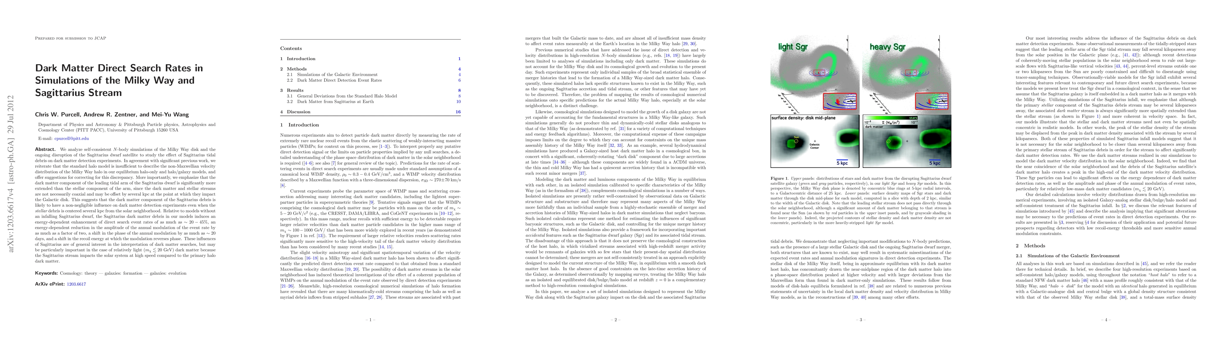 This paper investigates the impact of Sagittarius dwarf tidal debris on dark matter detection experiments using N-body simulations. It finds that the dark matter in the Sagittarius stream significantly influences direct search rates, inducing up to a 45% enhancement in event rates and altering the annual modulation phase and amplitude.