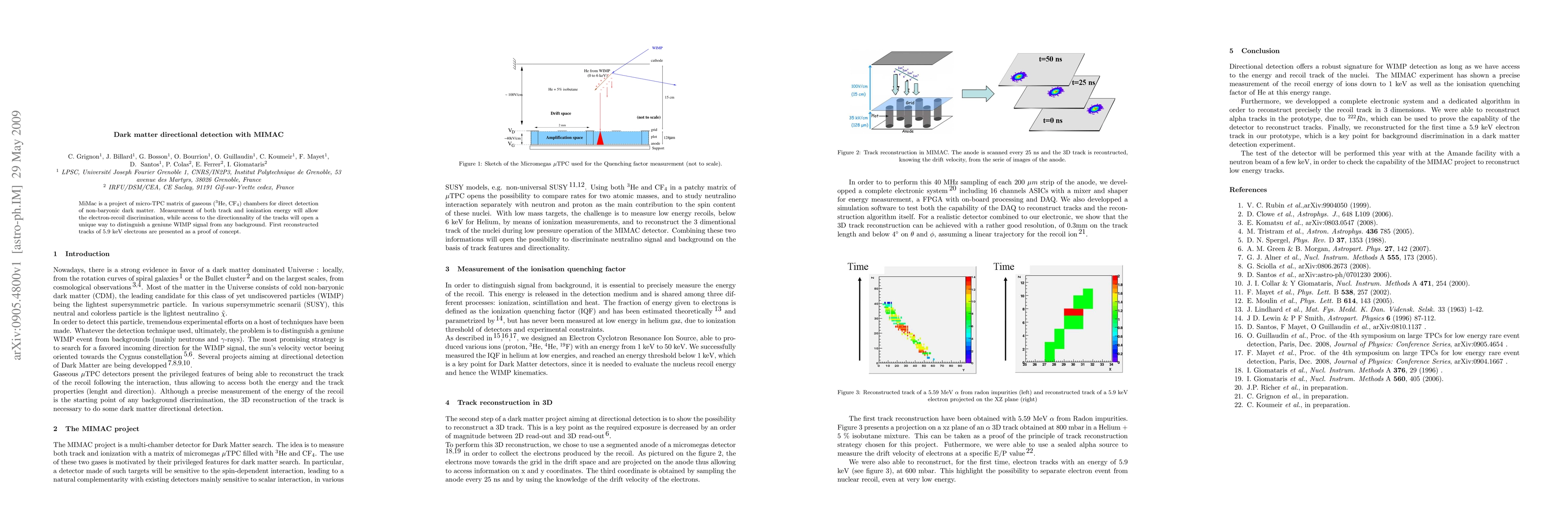 The MIMAC project develops a novel approach to dark matter detection by combining track and ionization energy measurements with 3D track reconstruction.