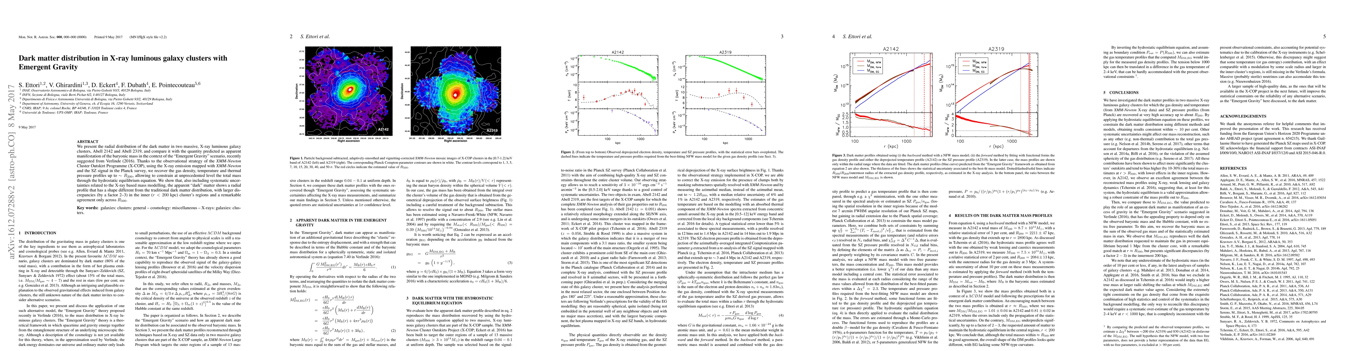 We present the radial distribution of the dark matter in two massive, X-ray luminous galaxy clusters, Abell~2142 and Abell~2319, and compare it with the quantity predicted as apparent manifestation of the baryonic mass in the context of the "Emergent Gravity" scenario, recently suggested from Verlinde (2016). Thanks to the observational strategy of the \xmm\ Cluster Outskirt Programme (X-COP), using the X-ray emission mapped with \xmm\ and the SZ signal in the Planck survey, we recover the gas density, temperature and thermal pressure profiles up to $\sim R_{200}$, allowing to constrain at unprecedented level the total mass through the hydrostatic equilibrium equation. We show that, also including systematic uncertainties related to the X-ray based mass modelling, the apparent "dark" matter shows a radial profile that has a shape different from the traditional dark matter distribution, with larger discrepancies (by a factor 2--3) in the inner ($r<200$ kpc) cluster's regions and a remarkable agreement only across $R_{500}$.