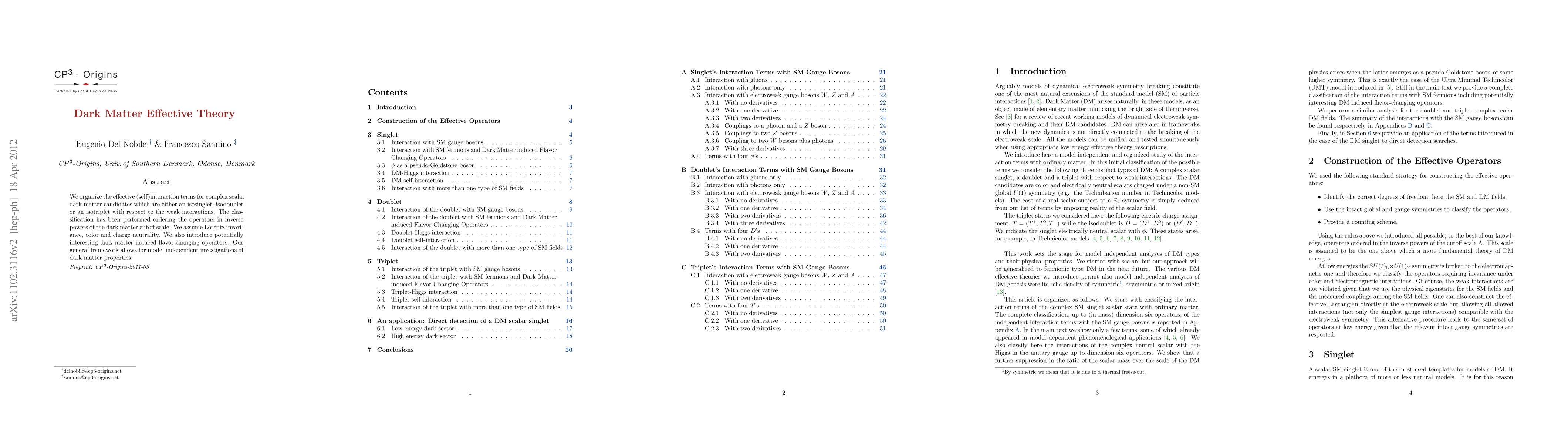 This research paper develops a framework for organizing dark matter effective theory, categorizing complex scalar candidates based on their weak interaction properties. It provides a model-independent approach to investigating dark matter properties with potentially interesting flavor-changing operators.