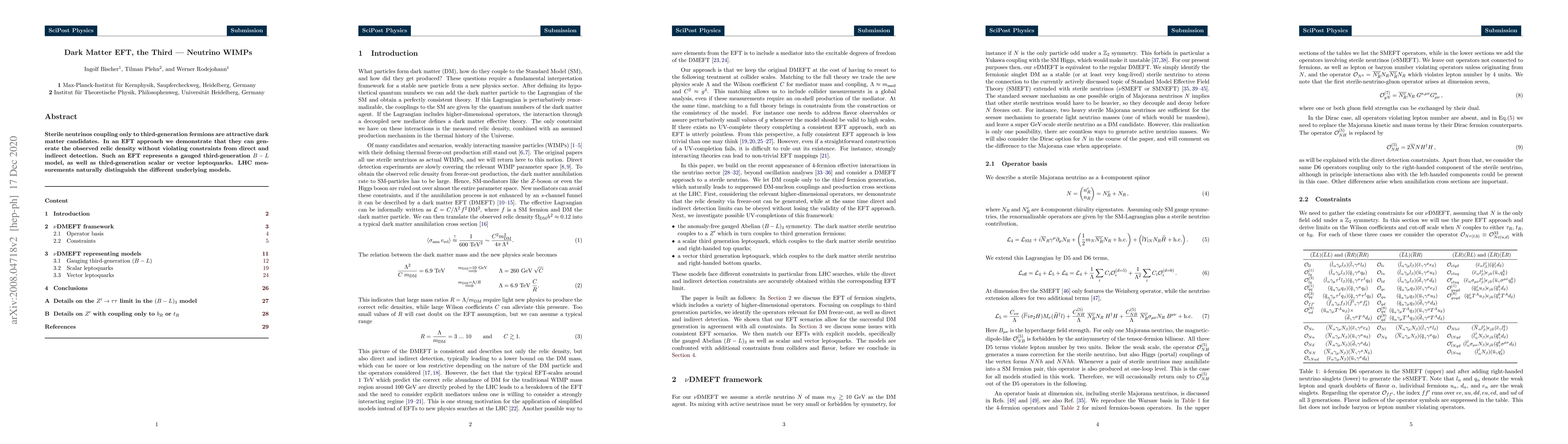 Sterile neutrinos coupling only to third-generation fermions are attractive dark matter candidates. In an EFT approach we demonstrate that they can generate the observed relic density without violating constraints from direct and indirect detection. Such an EFT represents a gauged third-generation $B-L$ model, as well as third-generation scalar or vector leptoquarks. LHC measurements naturally distinguish the different underlying models.