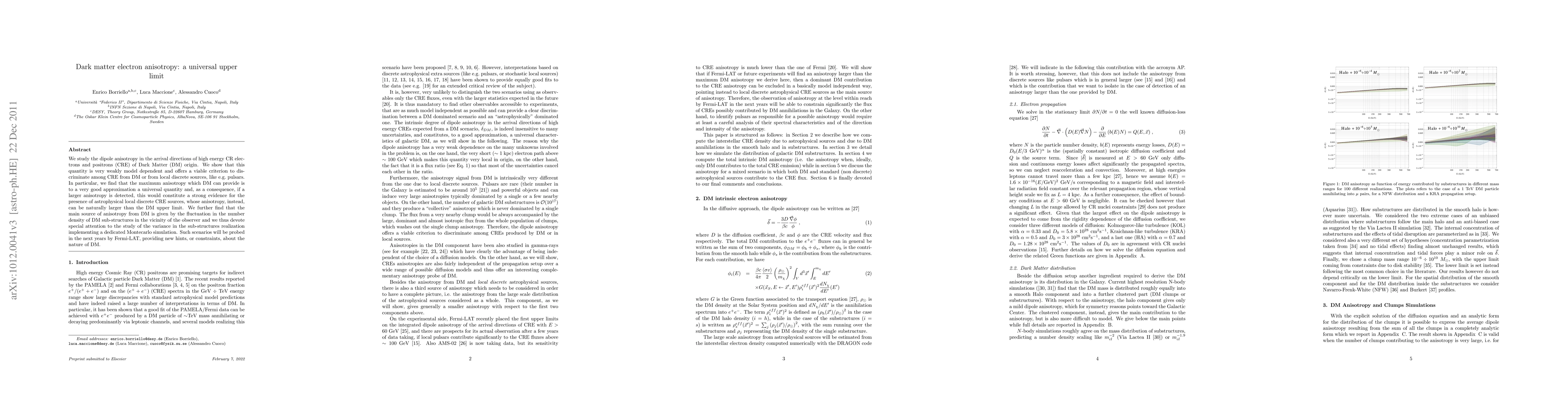 We study the dipole anisotropy in the arrival directions of high energy CR electrons and positrons (CRE) of Dark Matter (DM) origin. We show that this quantity is very weakly model dependent and offers a viable criterion to discriminate among CRE from DM or from local discrete sources, like e.g. pulsars. In particular, we find that the maximum anisotropy which DM can provide is to a very good approximation a universal quantity and, as a consequence, if a larger anisotropy is detected, this would constitute a strong evidence for the presence of astrophysical local discrete CRE sources, whose anisotropy, instead, can be naturally larger than the DM upper limit. We further find that the main source of anisotropy from DM is given by the fluctuation in the number density of DM sub-structures in the vicinity of the observer and we thus devote special attention to the study of the variance in the sub-structures realization implementing a dedicated Montecarlo simulation. Such scenarios will be probed in the next years by Fermi-LAT, providing new hints, or constraints, about the nature of DM.