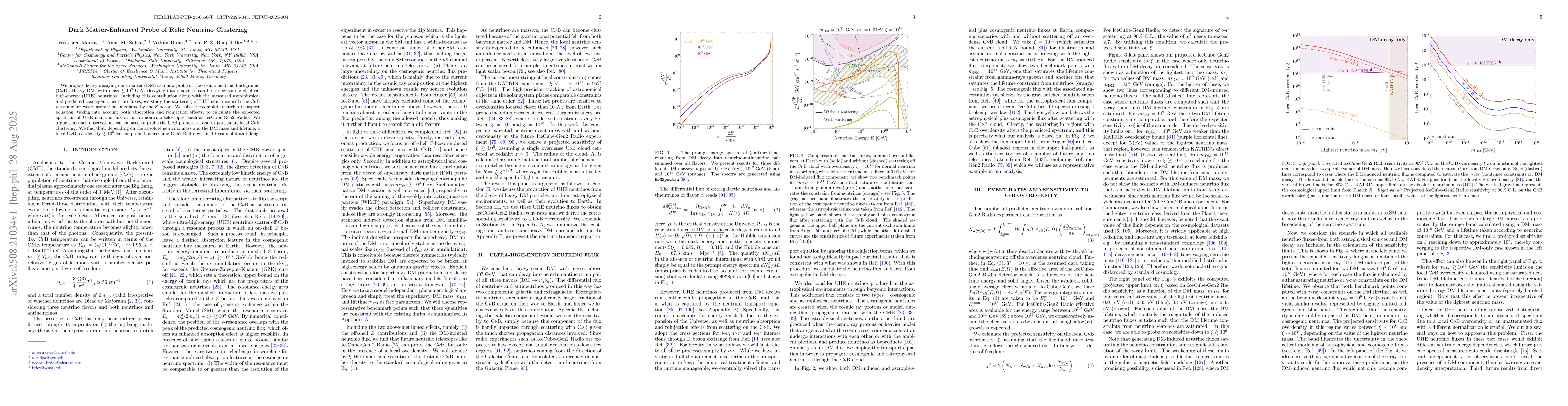 We propose heavy decaying dark matter (DM) as a new probe of the cosmic neutrino background (C$\nu$B). Heavy DM, with mass $\gtrsim 10^9$ GeV, decaying into neutrinos can be a new source of ultra-high-energy (UHE) neutrinos. Including this contribution along with the measured astrophysical and predicted cosmogenic neutrino fluxes, we study the scattering of UHE neutrinos with the C$\nu$B via standard weak interactions mediated by the $Z$-boson. We solve the complete neutrino transport equation, taking into account both absorption and reinjection effects, to calculate the expected spectrum of UHE neutrino flux at future neutrino telescopes, such as IceCube-Gen2 Radio. We argue that such observations can be used to probe the C$\nu$B properties, and in particular, local C$\nu$B clustering. We find that, depending on the absolute neutrino mass and the DM mass and lifetime, a local C$\nu$B overdensity $\gtrsim 10^6$ can be probed at IceCube-Gen2 Radio within 10 years of data taking.