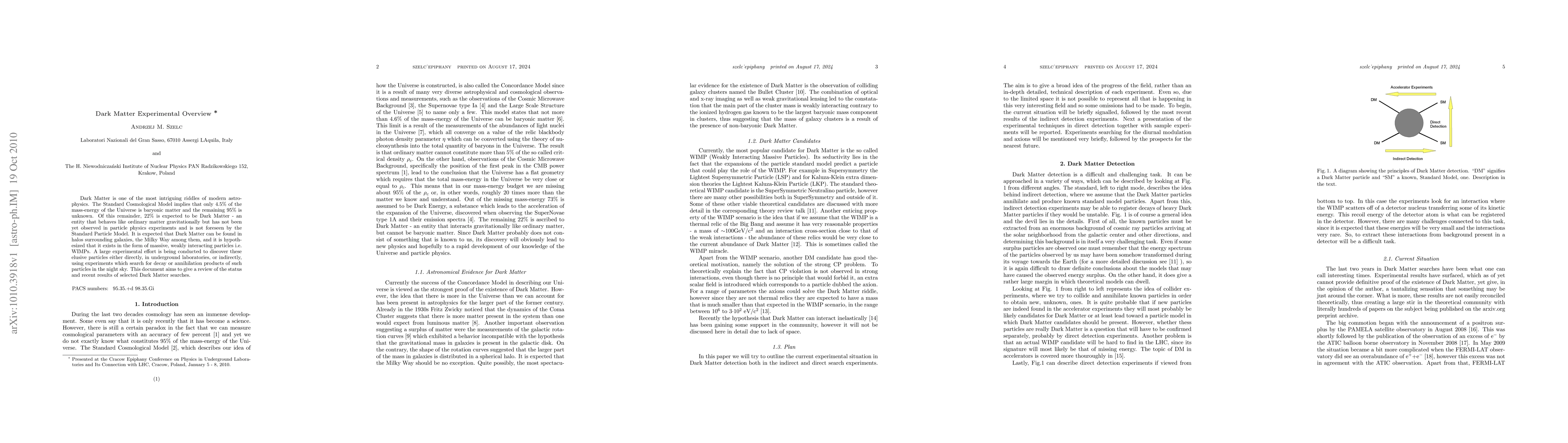 This paper reviews the current experimental efforts to detect Dark Matter, emphasizing the significant role it plays in the universe's mass-energy composition and the ongoing searches for weakly interacting massive particles (WIMPs) through direct and indirect detection methods. Recent results and advancements in these experimental endeavors are highlighted.