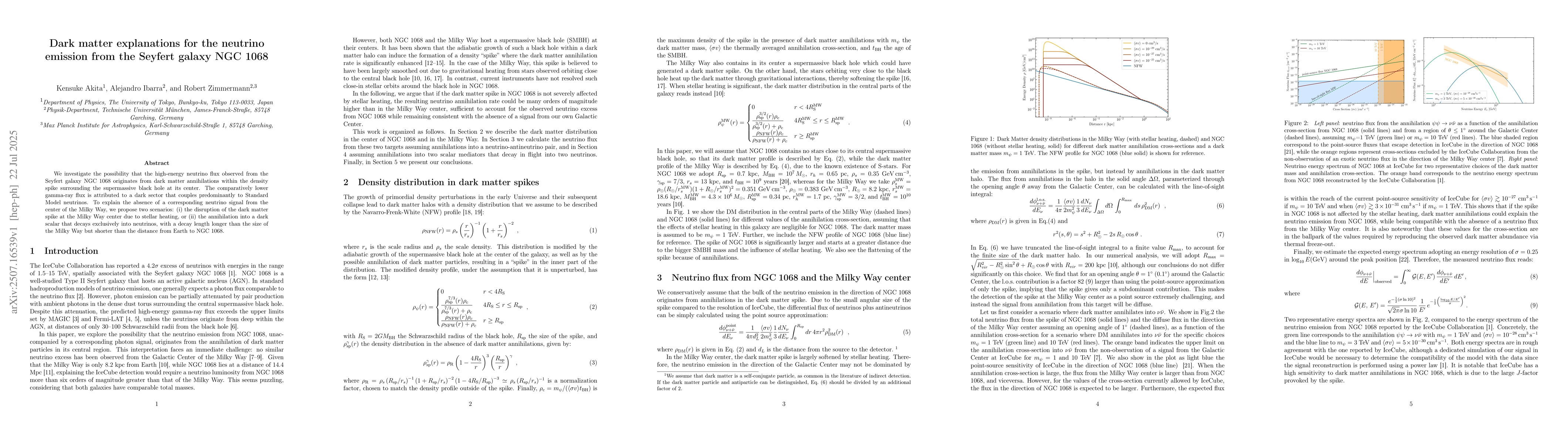 The research investigates the possibility of high-energy neutrino emission from the Seyfert galaxy NGC 1068 originating from dark matter annihilations within a density spike surrounding its central supermassive black hole.