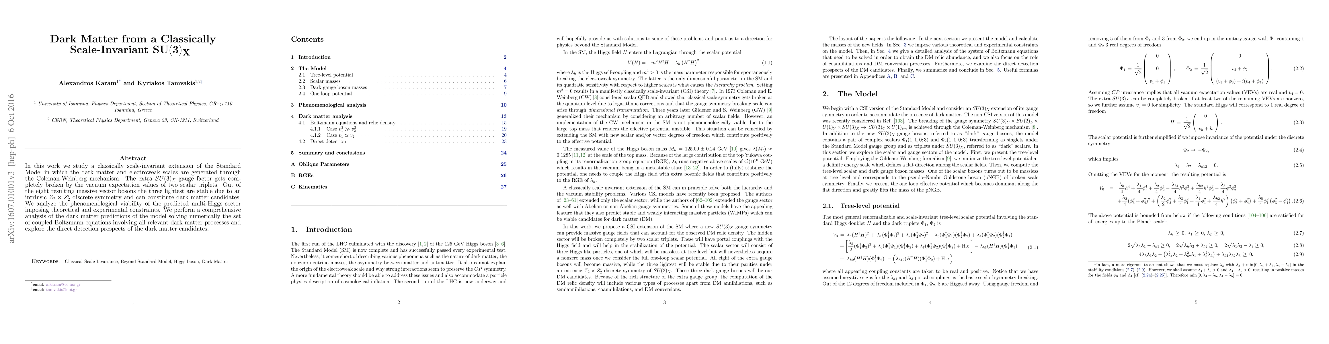 In this work we study a classically scale-invariant extension of the Standard Model in which the dark matter and electroweak scales are generated through the Coleman-Weinberg mechanism. The extra $SU(3)_X$ gauge factor gets completely broken by the vacuum expectation values of two scalar triplets. Out of the eight resulting massive vector bosons the three lightest are stable due to an intrinsic $Z_2\times Z_2'$ discrete symmetry and can constitute dark matter candidates. We analyze the phenomenological viability of the predicted multi-Higgs sector imposing theoretical and experimental constraints. We perform a comprehensive analysis of the dark matter predictions of the model solving numerically the set of coupled Boltzmann equations involving all relevant dark matter processes and explore the direct detection prospects of the dark matter candidates.