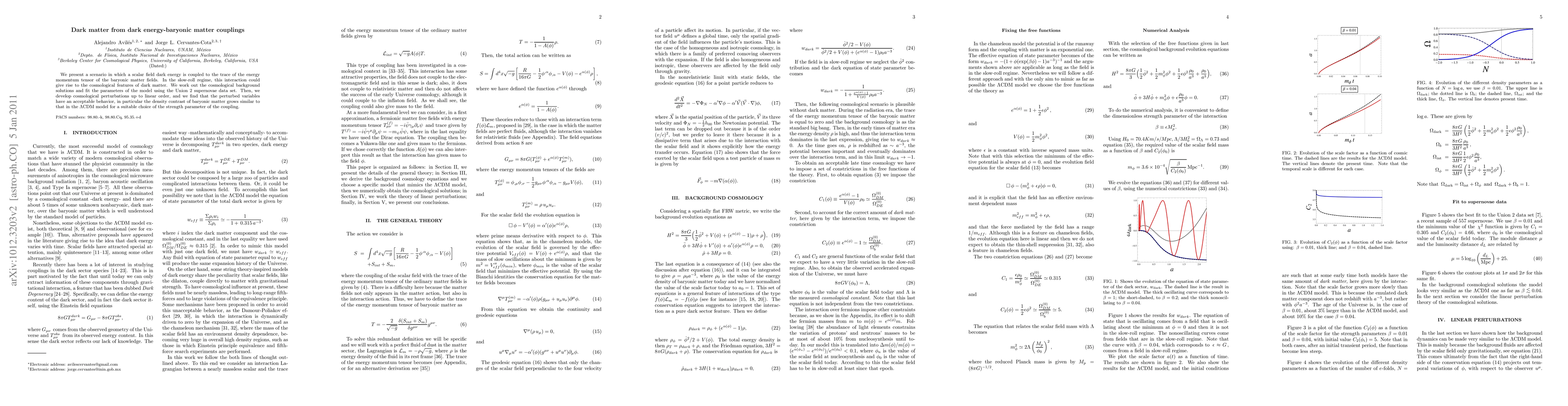 This paper explores a model where dark matter emerges from a scalar field dark energy coupled to baryonic matter, achieving cosmological features in the slow-roll regime. The model's parameters are fitted using supernovae data, and it shows acceptable behavior in cosmological perturbations, with baryonic matter density contrast growing similarly to the $\Lambda$CDM model.