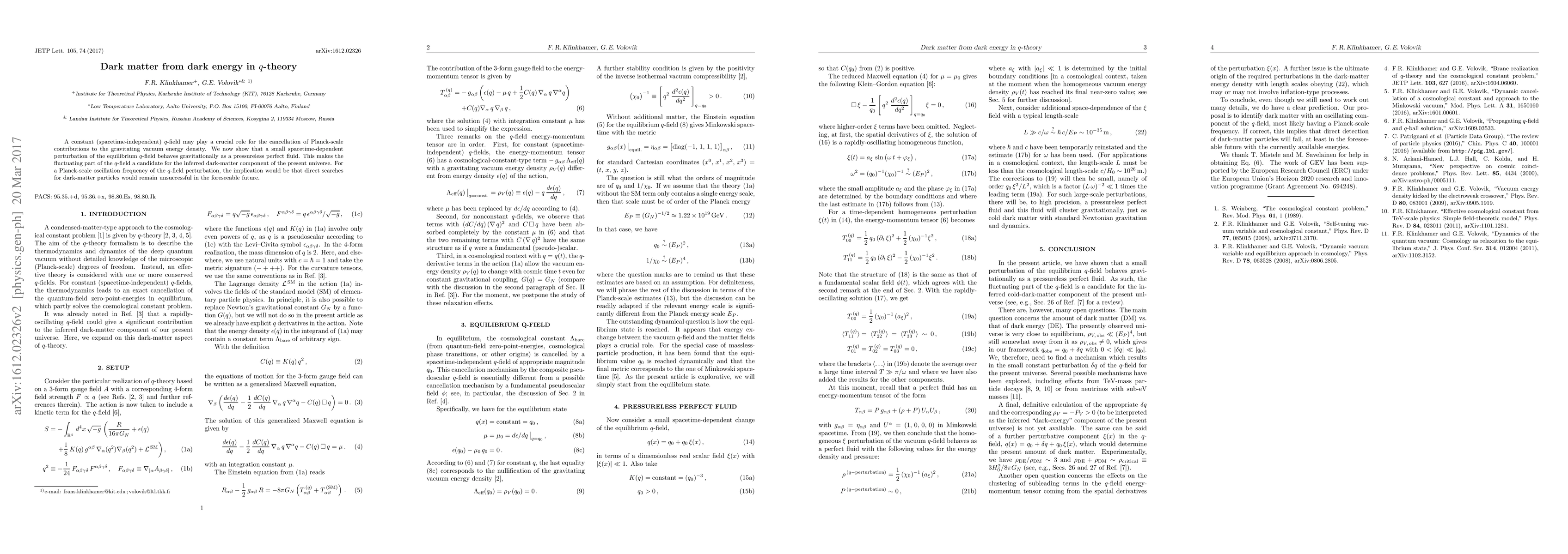 A constant (spacetime-independent) $q$-field may play a crucial role for the cancellation of Planck-scale contributions to the gravitating vacuum energy density. We now show that a small spacetime-dependent perturbation of the equilibrium $q$-field behaves gravitationally as a pressureless perfect fluid. This makes the fluctuating part of the $q$-field a candidate for the inferred dark-matter component of the present universe. For a Planck-scale oscillation frequency of the $q$-field perturbation, the implication would be that direct searches for dark-matter particles would remain unsuccessful in the foreseeable future.
