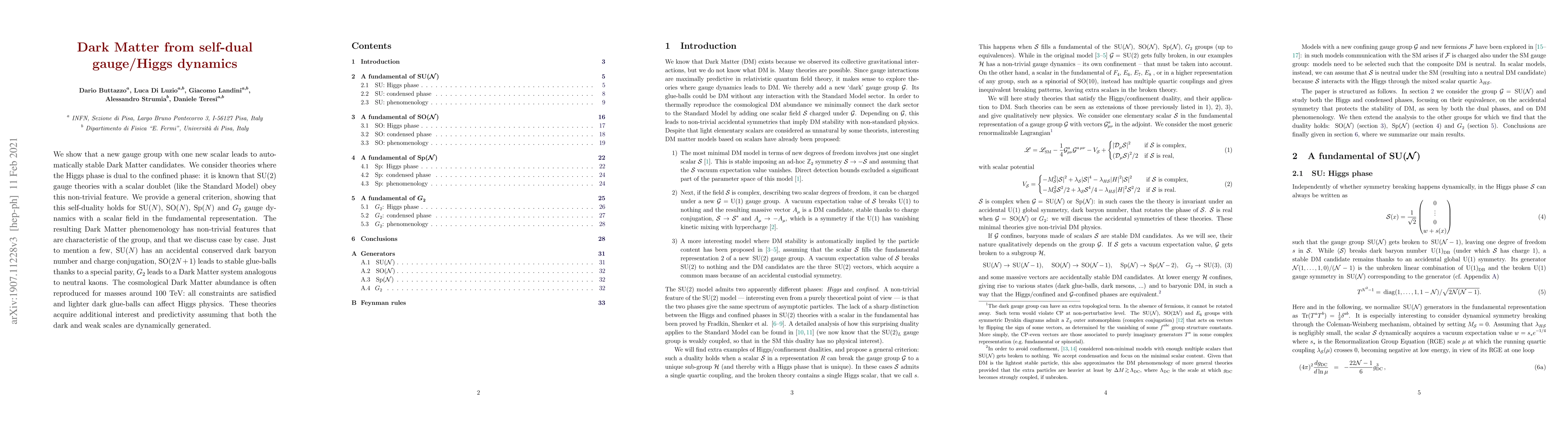 We show that a new gauge group with one new scalar leads to automatically stable Dark Matter candidates. We consider theories where the Higgs phase is dual to the confined phase: it is known that SU(2) gauge theories with a scalar doublet (like the Standard Model) obey this non-trivial feature. We provide a general criterion, showing that this self-duality holds for SU(N), SO(N), Sp(N) and G_2 gauge dynamics with a scalar field in the fundamental representation. The resulting Dark Matter phenomenology has non-trivial features that are characteristic of the group, and that we discuss case by case. Just to mention a few, SU(N) has an accidental conserved dark baryon number, SO(2N+1) leads to stable glue-balls thanks to a special parity, G_2 leads to a Dark Matter system analogous to neutral kaons. The cosmological Dark Matter abundance is often reproduced for masses around 100 TeV: all constraints are satisfied and lighter dark glue-balls can affect Higgs physics. These theories acquire additional interest and predictivity assuming that both the dark and weak scales are dynamically generated.