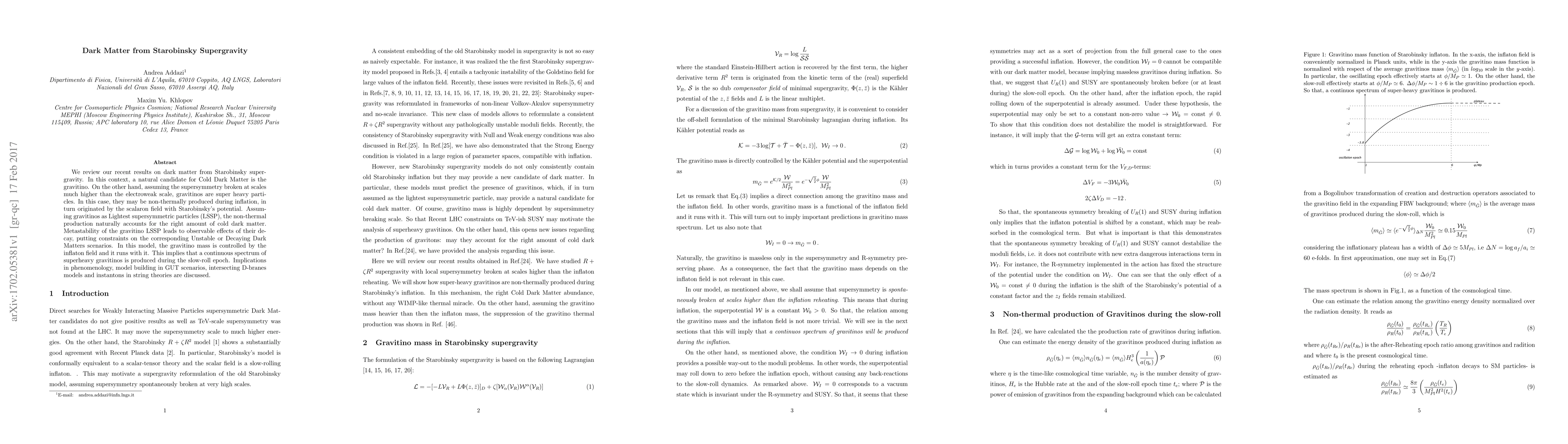 We review our recent results on dark matter from Starobinsky supergravity. In this context, a natural candidate for Cold Dark Matter is the gravitino. On the other hand, assuming the supersymmetry broken at scales much higher than the electroweak scale, gravitinos are super heavy particles. In this case, they may be non-thermally produced during inflation, in turn originated by the scalaron field with Starobinsky's potential.Assuming gravitinos as Lightest supersymmetric particles (LSSP), the non-thermal production naturally accounts for the right amount of cold dark matter. Metastability of the gravitino LSSP leads to observable effects of their decay, putting constraints on the corresponding Unstable or Decaying Dark Matters scenarios. In this model, the gravitino mass is controlled by the inflaton field and it runs with it. This implies that a continuous spectrum of superheavy gravitinos is produced during the slow-roll epoch. Implications in phenomenology, model building in GUT scenarios, intersecting D-branes models and instantons in string theories are discussed.