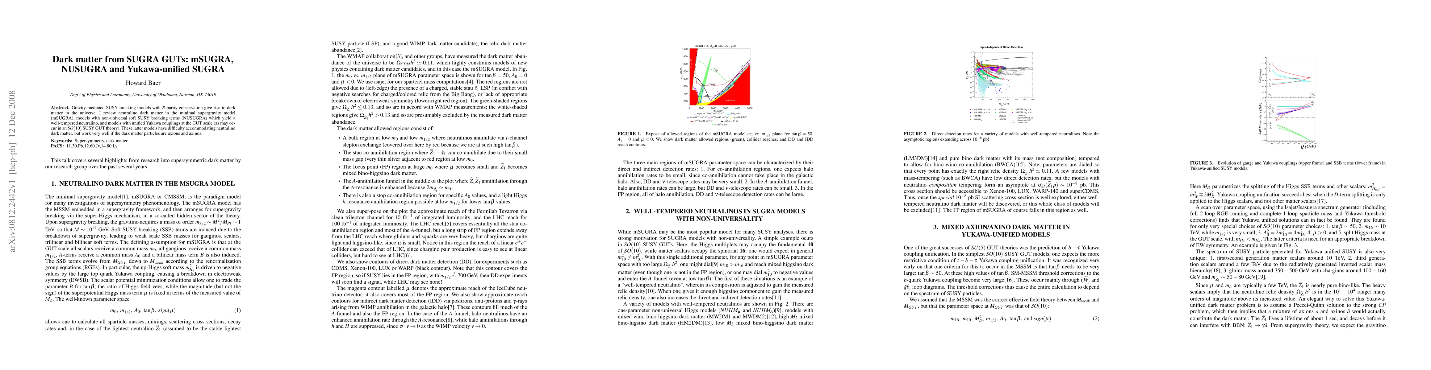 This paper reviews neutralino dark matter in gravity-mediated SUSY breaking models, focusing on the minimal (mSUGRA) and non-universal (NUSUGRA) scenarios, and discusses the challenges and potential for axions and axinos in unified Yukawa SUGRA GUT theories.