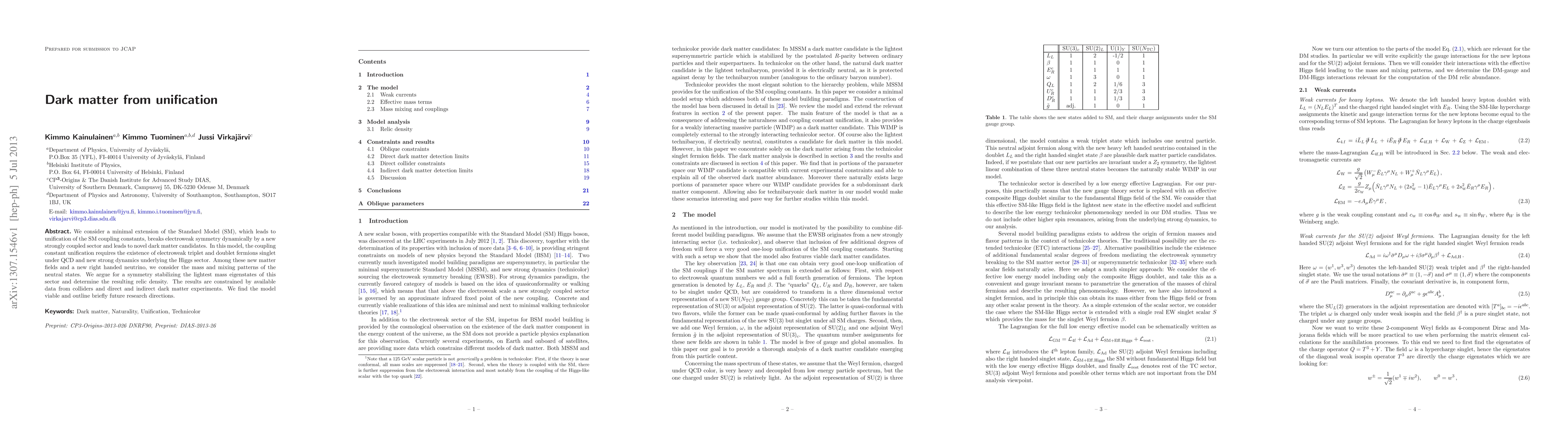 We consider a minimal extension of the Standard Model (SM), which leads to unification of the SM coupling constants, breaks electroweak symmetry dynamically by a new strongly coupled sector and leads to novel dark matter candidates. In this model, the coupling constant unification requires the existence of electroweak triplet and doublet fermions singlet under QCD and new strong dynamics underlying the Higgs sector. Among these new matter fields and a new right handed neutrino, we consider the mass and mixing patterns of the neutral states. We argue for a symmetry stabilizing the lightest mass eigenstates of this sector and determine the resulting relic density. The results are constrained by available data from colliders and direct and indirect dark matter experiments. We find the model viable and outline briefly future research directions.