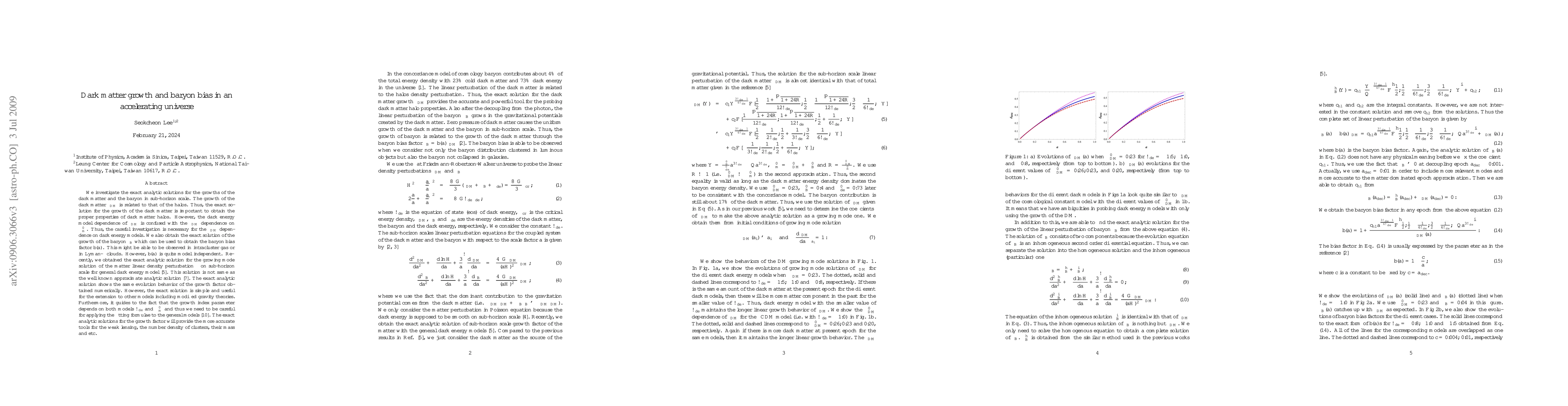 We investigate the exact analytic solutions for the growths of the dark matter and the baryon in sub-horizon scale. The growth of the dark matter $\delta_{\DM}$ is related to that of the halos. Thus, the exact solution for the growth of the dark matter is important to obtain the proper properties of dark matter halos. However, the dark energy model dependence of $\delta_{\DM}$ is confused with the $\delta_{\DM}$ dependence on $\Omega_{m}^{0}$. Thus, the careful investigation is necessary for the $\delta_{\DM}$ dependence on dark energy models. We also obtain the exact solution of the growth of the baryon $\delta_{\B}$ which can be used to obtain the baryon bias factor $b(a)$. This might be able to be observed in intracluster gas or in Lyman-$\alpha$ clouds. However, $b(a)$ is quite model independent. Recently, we obtained the exact analytic solution for the growing mode solution of the matter linear density perturbation $\delta$ on sub-horizon scale for general dark energy model \cite{SK}. This solution is not same as the well known approximate analytic solution \cite{Waga}. The exact analytic solution shows the same evolution behavior of the growth factor obtained numerically. However, the exact solution is simple and useful for the extension to other models including modified gravity theories. Furthermore, it guides to the fact that the growth index parameter depends on both models $\omega_{\de}$ and $\Omega_{m}^{0}$ and thus we need to be careful for applying the fitting formulae to the general models \cite{WS}. The exact analytic solutions for the growth factor will provide the more accurate tools for the weak lensing, the number density of clusters, their mass and etc.