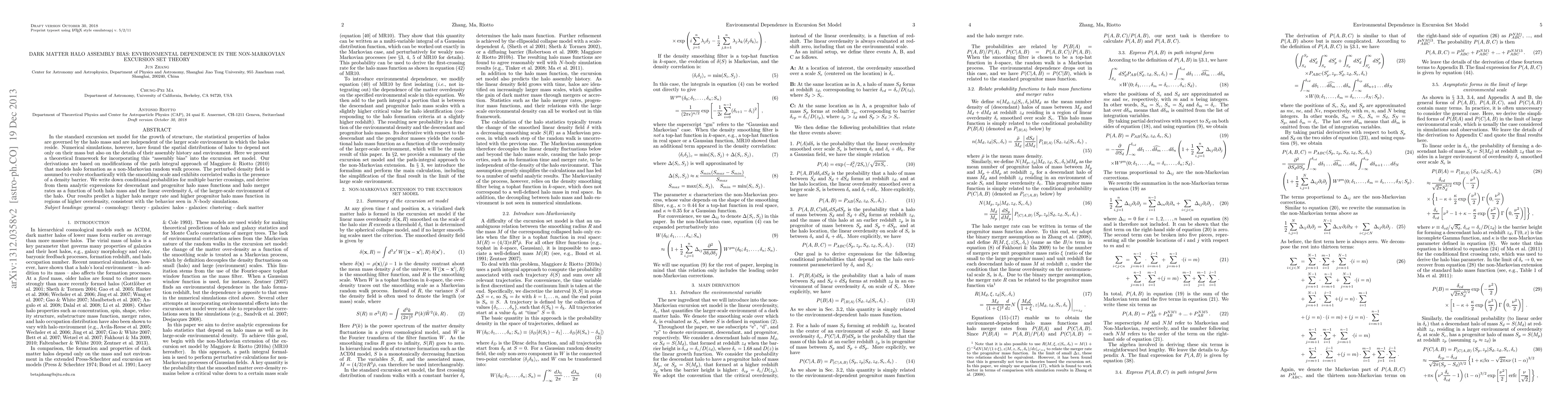 This paper develops a theoretical framework to incorporate "assembly bias" into the excursion set model, showing that halo properties depend on both mass and environment. It modifies the non-Markovian random walk approach to derive analytic expressions for halo merger rates and mass functions, predicting higher rates in denser regions.