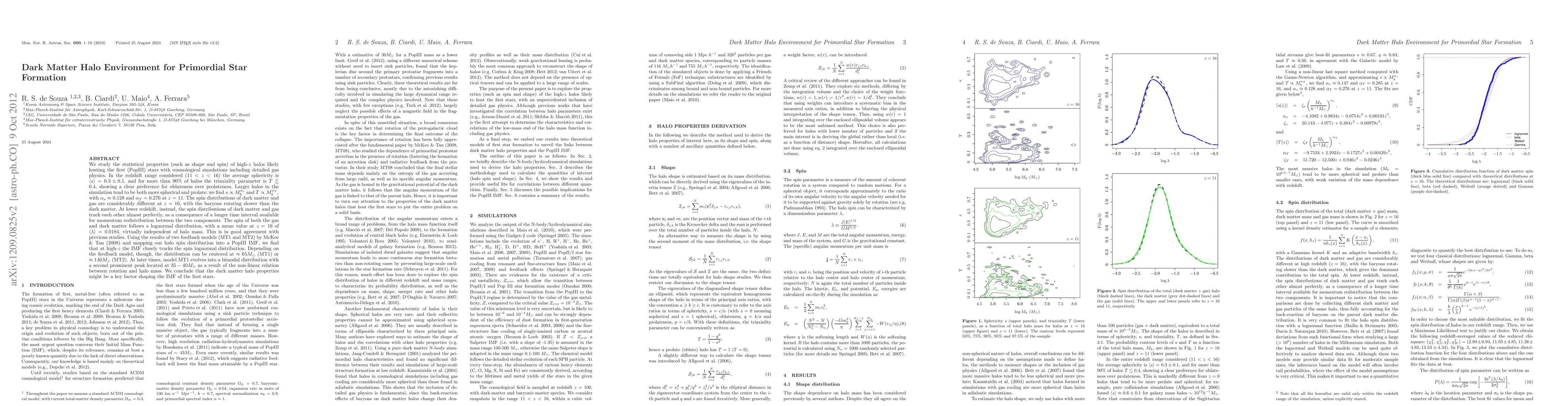 High-z dark matter halo simulations suggest that first stars may have formed in more oblate halos with a lognormal spin distribution, while later-time models show bimodal distributions influenced by feedback mechanisms.