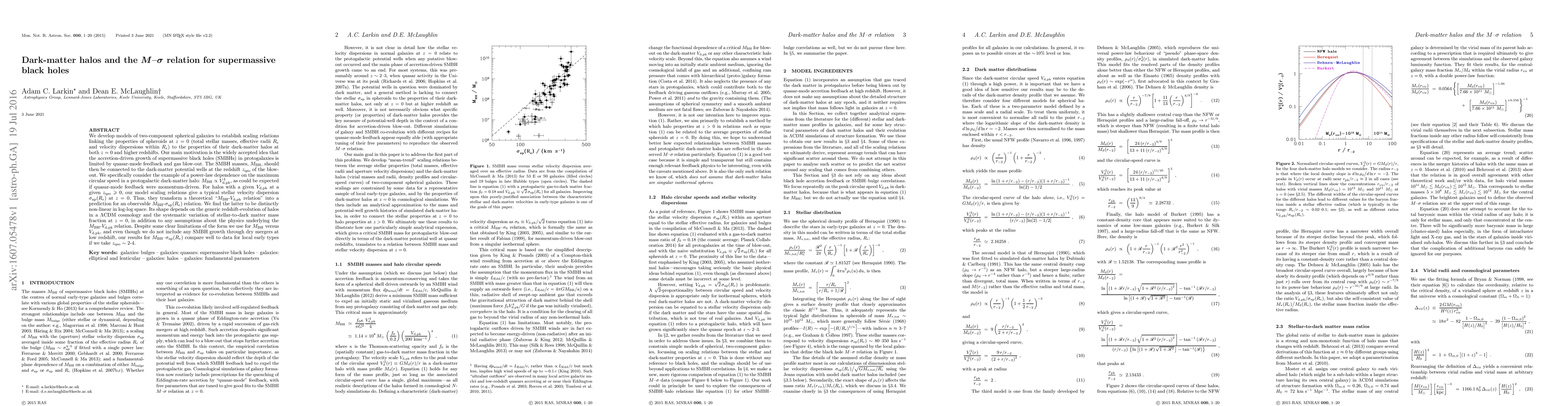 We develop models of two-component spherical galaxies to establish scaling relations linking the properties of spheroids at $z=0$ (total stellar masses, effective radii $R_e$ and velocity dispersions within $R_e$) to the properties of their dark-matter halos at both $z=0$ and higher redshifts. . Our main motivation is the widely accepted idea that the accretion-driven growth of supermassive black holes (SMBHs) in protogalaxies is limited by quasar-mode feedback and gas blow-out. The SMBH masses, $M_{\rm{BH}}$, should then be connected to the dark-matter potential wells at the redshift $z_{\rm{qso}}$ of the blow-out. We specifically consider the example of a power-law dependence on the maximum circular speed in a protogalactic dark-matter halo: $M_{\rm{BH}}\propto V^4_{\rm{d,pk}}$, as could be expected if quasar-mode feedback were momentum-driven. For halos with a given $V_{\rm{d,pk}}$ at a given $z_{\rm{qso}}\ge 0$, our model scaling relations give a typical stellar velocity dispersion $\sigma_{\rm{ap}}(R_e)$ at $z=0$. Thus, they transform a theoretical $M_{\rm{BH}}$-$V_{\rm{d,pk}}$ relation into a prediction for an observable $M_{\rm{BH}}$-$\sigma_{\rm{ap}}(R_e)$ relation. We find the latter to be distinctly non-linear in log-log space. Its shape depends on the generic redshift-evolution of halos in a {$\Lambda$}CDM cosmology and the systematic variation of stellar-to-dark matter mass fraction at $z=0$, in addition to any assumptions about the physics underlying the $M_{\rm{BH}}$-$V_{\rm{d,pk}}$ relation. Despite some clear limitations of the form we use for $M_{\rm{BH}}$ versus $V_{\rm{d,pk}}$, and even though we do not include any SMBH growth through dry mergers at low redshift, our results for $M_{\rm{BH}}$-$\sigma_{\rm{ap}}(R_e)$ compare well to data for local early types if we take $z_{\rm{qso}} \sim$ 2-4.