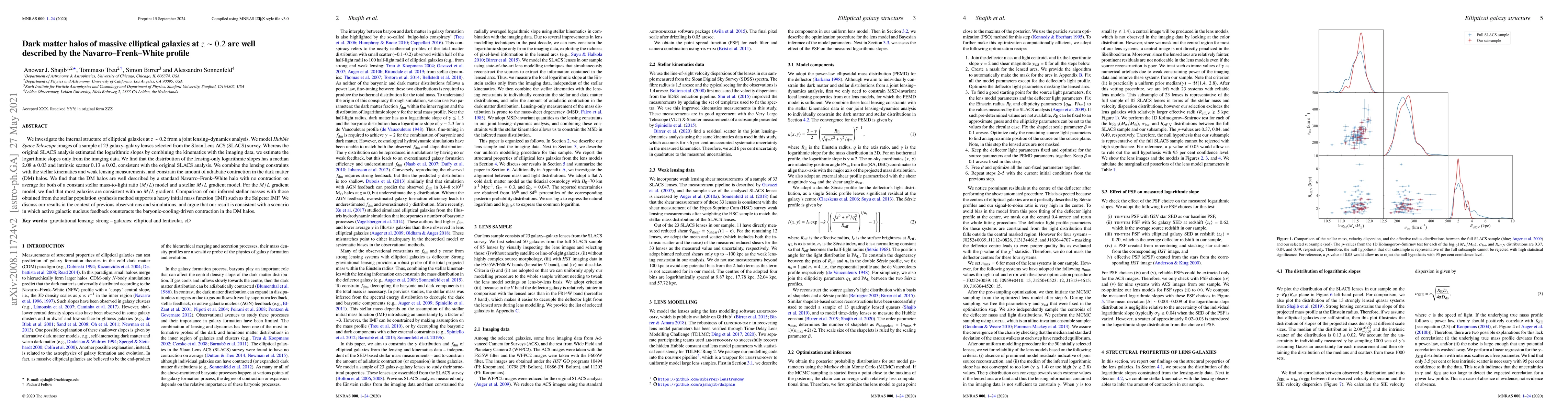 We investigate the internal structure of elliptical galaxies at $z\sim 0.2$ from a joint lensing-dynamics analysis. We model Hubble Space Telescope images of a sample of 23 galaxy-galaxy lenses selected from the Sloan Lens ACS (SLACS) survey. Whereas the original SLACS analysis estimated the logarithmic slopes by combining the kinematics with the imaging data, we estimate the logarithmic slopes only from the imaging data. We find that the distribution of the lensing-only logarithmic slopes has a median $2.08\pm0.03$ and intrinsic scatter $0.13 \pm 0.02$, consistent with the original SLACS analysis. We combine the lensing constraints with the stellar kinematics and weak lensing measurements, and constrain the amount of adiabatic contraction in the dark matter (DM) halos. We find that the DM halos are well described by a standard Navarro-Frenk-White halo with no contraction on average for both of a constant stellar mass-to-light ratio ($M/L$) model and a stellar $M/L$ gradient model. For the $M/L$ gradient model, we find that most galaxies are consistent with no $M/L$ gradient. Comparison of our inferred stellar masses with those obtained from the stellar population synthesis method supports a heavy initial mass function (IMF) such as the Salpeter IMF. We discuss our results in the context of previous observations and simulations, and argue that our result is consistent with a scenario in which active galactic nucleus feedback counteracts the baryonic-cooling-driven contraction in the DM halos.