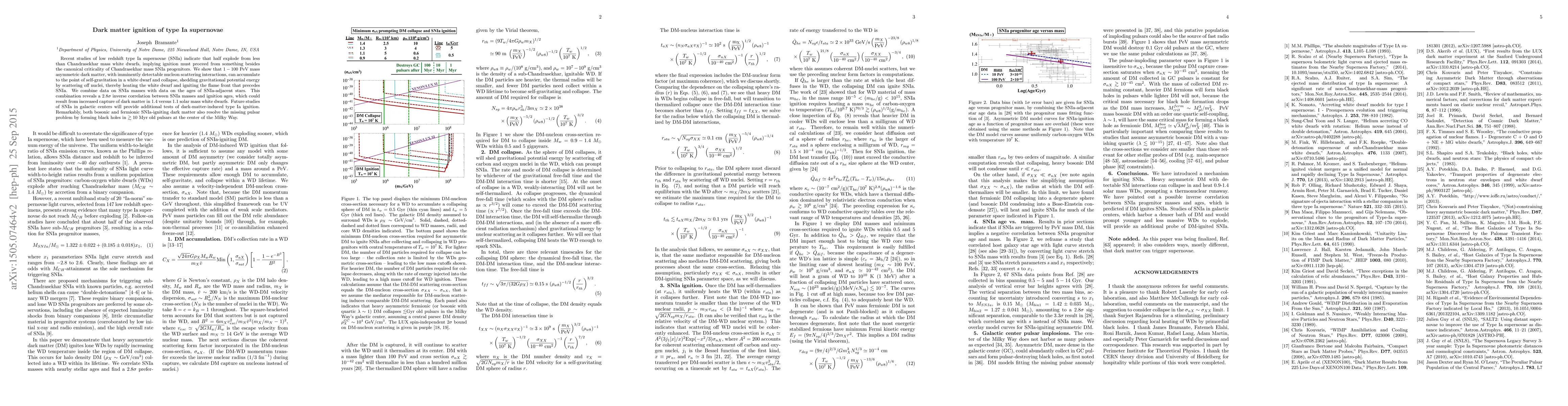 Recent studies of low redshift type Ia supernovae (SNIa) indicate that half explode from less than Chandrasekhar mass white dwarfs, implying ignition must proceed from something besides the canonical criticality of Chandrasekhar mass SNIa progenitors. We show that $1-100$ PeV mass asymmetric dark matter, with imminently detectable nucleon scattering interactions, can accumulate to the point of self-gravitation in a white dwarf and collapse, shedding gravitational potential energy by scattering off nuclei, thereby heating the white dwarf and igniting the flame front that precedes SNIa. We combine data on SNIa masses with data on the ages of SNIa-adjacent stars. This combination reveals a $2.8 \sigma$ inverse correlation between SNIa masses and ignition ages, which could result from increased capture of dark matter in 1.4 versus 1.1 solar mass white dwarfs. Future studies of SNIa in galactic centers will provide additional tests of dark-matter-induced type Ia ignition. Remarkably, both bosonic and fermionic SNIa-igniting dark matter also resolve the missing pulsar problem by forming black holes in $\gtrsim 10$ Myr old pulsars at the center of the Milky Way.