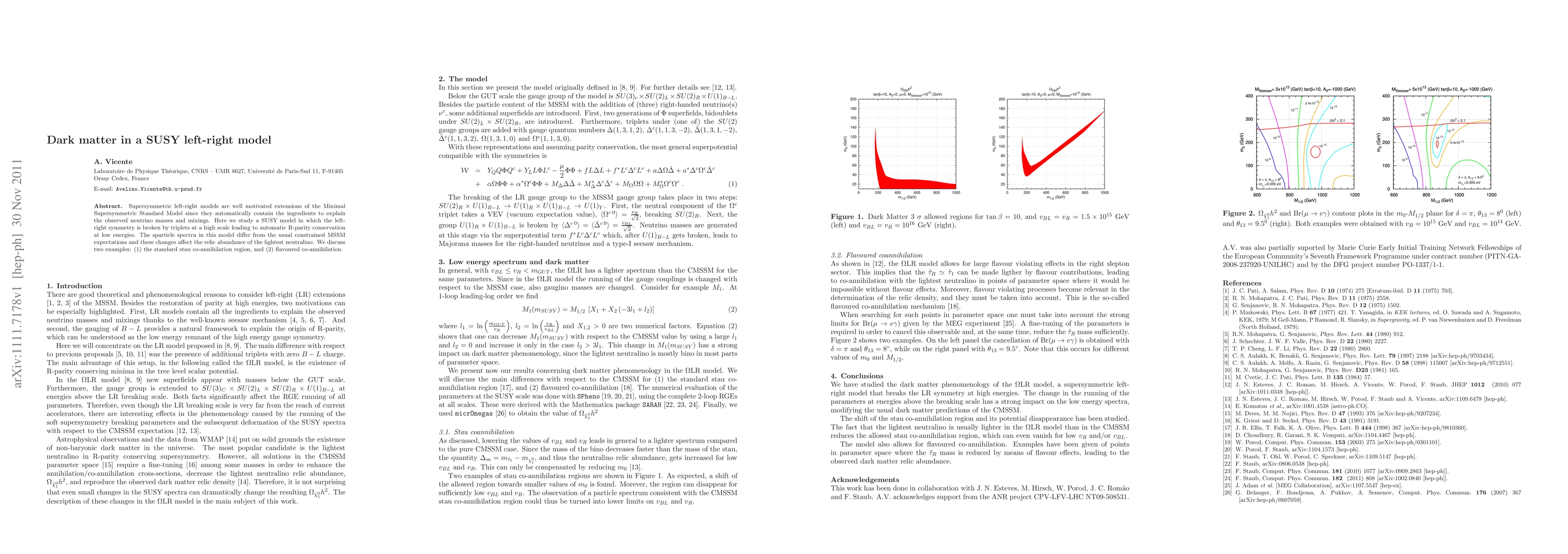 Supersymmetric left-right models are well motivated extensions of the Minimal Supersymmetric Standard Model since they automatically contain the ingredients to explain the observed neutrino masses and mixings. Here we study a SUSY model in which the left-right symmetry is broken by triplets at a high scale leading to automatic R-parity conservation at low energies. The sparticle spectra in this model differ from the usual constrained MSSM expectations and these changes affect the relic abundance of the lightest neutralino. We discuss two examples: (1) the standard stau co-annihilation region, and (2) flavoured co-annihilation.