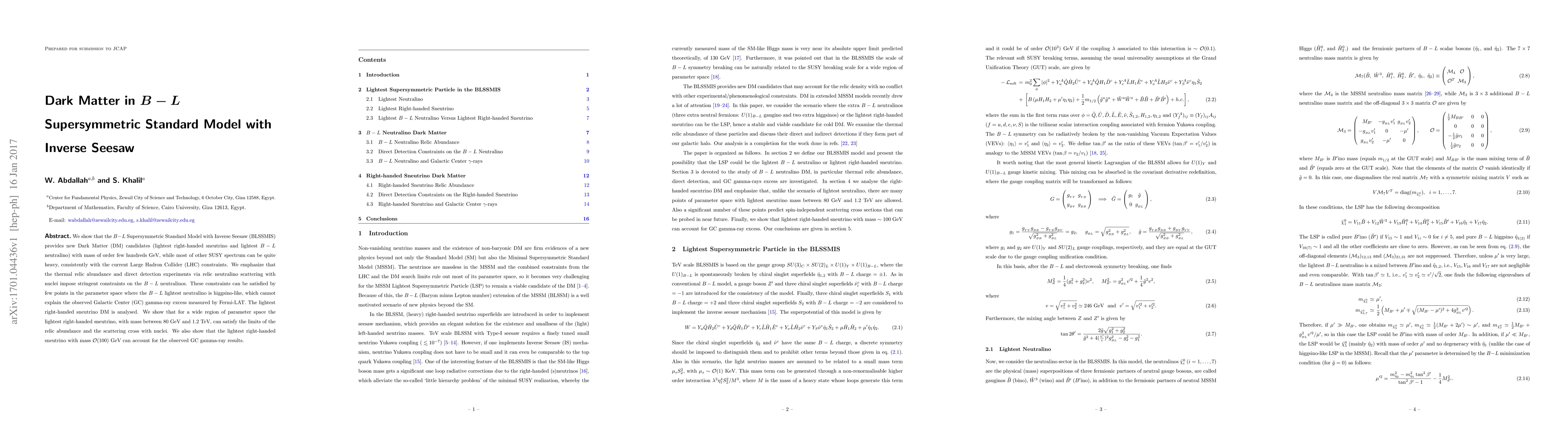 We show that the $B-L$ Supersymmetric Standard Model with Inverse Seesaw (BLSSMIS) provides new Dark Matter (DM) candidates (lightest right-handed sneutrino and lightest $B-L$ neutralino) with mass of order few hundreds GeV, while most of other SUSY spectrum can be quite heavy, consistently with the current Large Hadron Collider (LHC) constraints. We emphasize that the thermal relic abundance and direct detection experiments via relic neutralino scattering with nuclei impose stringent constraints on the $B-L$ neutralinos. These constraints can be satisfied by few points in the parameter space where the $B-L$ lightest neutralino is higgsino-like, which cannot explain the observed Galactic Center (GC) gamma-ray excess measured by Fermi-LAT. The lightest right-handed sneutrino DM is analysed. We show that for a wide region of parameter space the lightest right-handed sneutrino, with mass between 80 GeV and 1.2 TeV, can satisfy the limits of the relic abundance and the scattering cross with nuclei. We also show that the lightest right-handed sneutrino with mass ${\cal O}(100)$ GeV can account for the observed GC gamma-ray results.