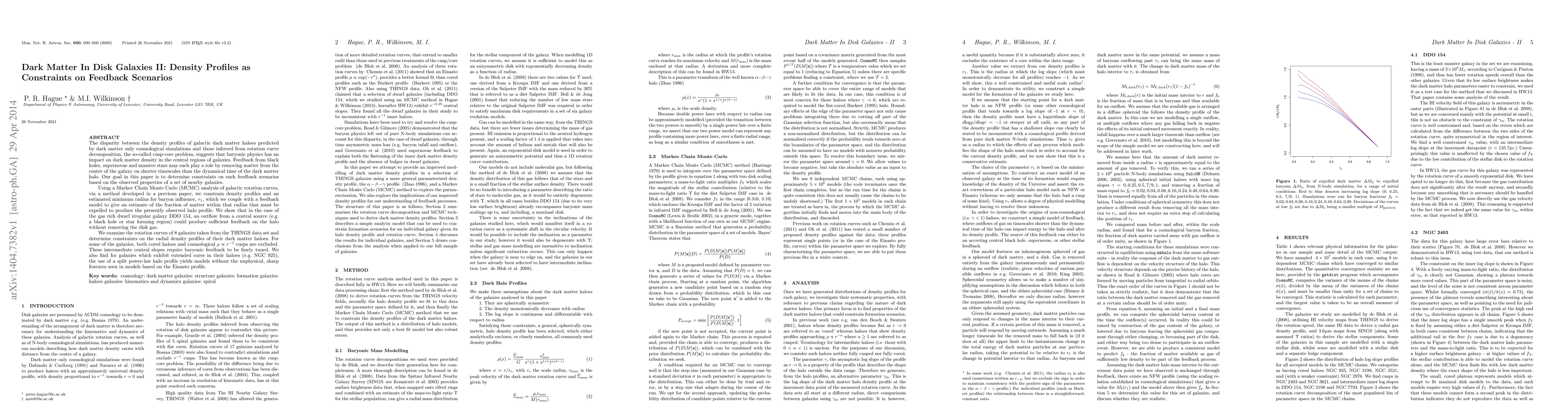 The disparity between the density profiles of galactic dark matter haloes predicted by dark matter only cosmological simulations and those inferred from rotation curve decomposition, the so-called cusp-core problem, suggests that baryonic physics has an impact on dark matter density in the central regions of galaxies. Feedback from black holes, supernovae and massive stars may each play a role by removing matter from the centre of the galaxy on shorter timescales than the dynamical time of the dark matter halo. Our goal in this paper is to determine constraints on such feedback scenarios based on the observed properties of a set of nearby galaxies. Using a Markov Chain Monte Carlo (MCMC) analysis of galactic rotation curves, via a method developed in a previous paper, we constrain density profiles and an estimated minimum radius for baryon influence, $r_1$, which we couple with a feedback model to give an estimate of the fraction of matter within that radius that must be expelled to produce the presently observed halo profile. We show that in the case of the gas rich dwarf irregular galaxy DDO 154, an outflow from a central source (e.g. a black hole or star forming region) could produce sufficient feedback on the halo without removing the disk gas. We examine the rotation curves of 8 galaxies taken from the THINGS data set and determine constraints on the radial density profiles of their dark matter haloes. For some of the galaxies, both cored haloes and cosmological $\rho \propto r^{-1}$ cusps are excluded. These intermediate central slopes require baryonic feedback to be finely tuned. We also find for galaxies which exhibit extended cores in their haloes (e.g. NGC 925), the use of a split power-law halo profile yields models without the unphysical, sharp features seen in models based on the Einasto profile.