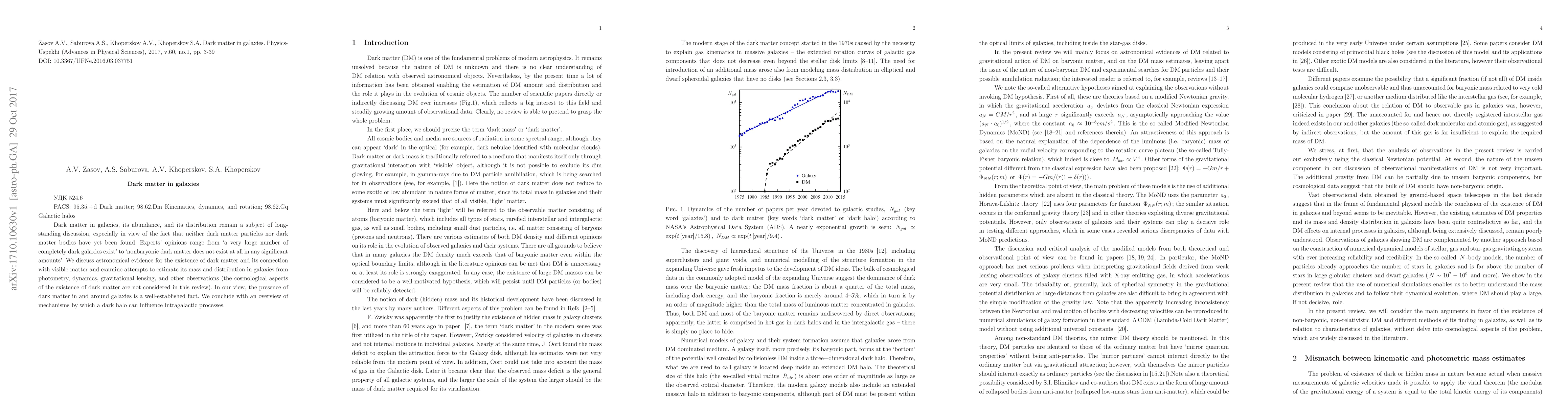 This paper reviews the evidence for dark matter in galaxies, emphasizing its abundance and distribution despite the lack of direct detection. It concludes that dark matter's presence is well-established and discusses its influence on intragalactic processes through mechanisms like gravitational effects.