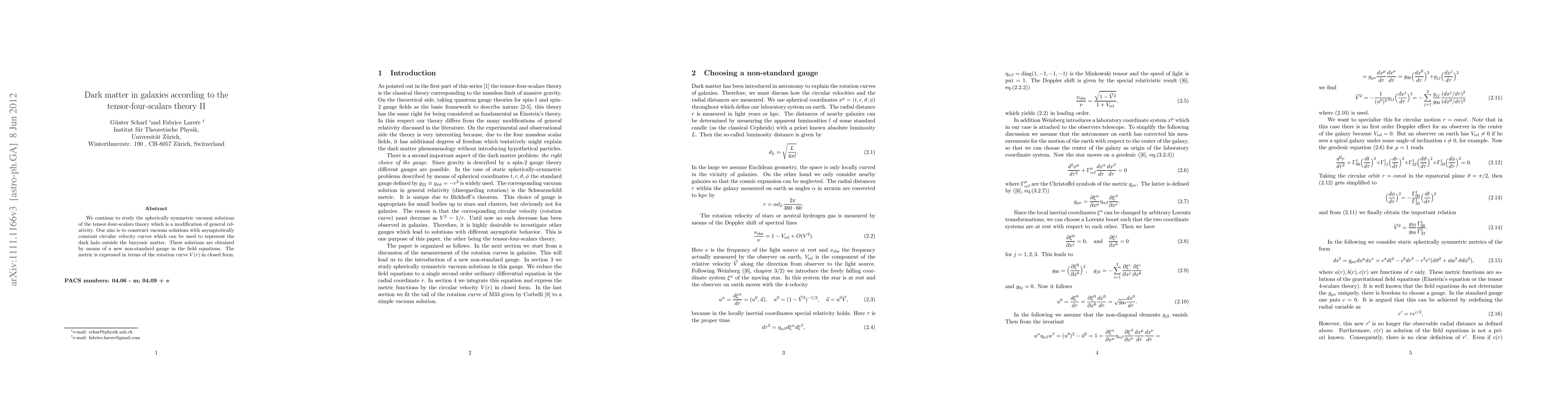 We continue to study the spherically symmetric vacuum solutions of the tensor-four-scalars theory which is a modification of general relativity. Our aim is to construct vacuum solutions with asymptotically constant circular velocity curves which can be used to represent the dark halo outside the baryonic matter. These solutions are obtained by means of a new non-standard gauge in the field equations. The metric is expressed in terms of the rotation curve $V(r)$ in closed form.