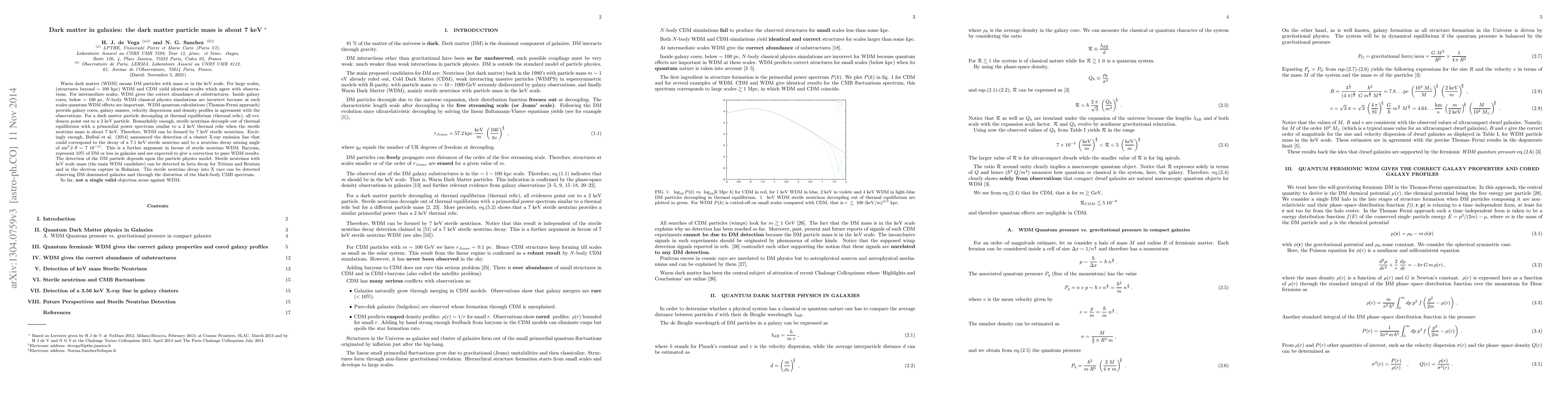 Warm dark matter (WDM) means DM particles with mass m in the keV scale. For large scales, (structures beyond ~ 100 kpc) WDM and CDM yield identical results which agree with observations. For intermediate scales, WDM gives the correct abundance of substructures. Inside galaxy cores, below ~ 100 pc, N-body WDM classical physics simulations are incorrect because at such scales quantum WDM effects are important. WDM quantum calculations (Thomas-Fermi approach) provide galaxy cores, galaxy masses, velocity dispersions and density profiles in agreement with the observations. For a dark matter particle decoupling at thermal equilibrium (thermal relic), all evidences point out to a 2 keV particle. Remarkably enough, sterile neutrinos decouple out of thermal equilibrium with a primordial power spectrum similar to a 2 keV thermal relic when the sterile neutrino mass is about 7 keV. Therefore, WDM can be formed by 7 keV sterile neutrinos. Excitingly enough, Bulbul et al. (2014) announced the detection of a cluster X-ray emission line that could correspond to the decay of a 7.1 keV sterile neutrino and to a neutrino decay mixing angle of \sin^2 2 \theta ~ 7 10^{-11} . This is a further argument in favour of sterile neutrino WDM. Baryons, represent 10 % of DM or less in galaxies and are expected to give a correction to pure WDM results. The detection of the DM particle depends upon the particle physics model. Sterile neutrinos with keV scale mass (the main WDM candidate) can be detected in beta decay for Tritium and Renium and in the electron capture in Holmiun. The sterile neutrino decay into X rays can be detected observing DM dominated galaxies and through the distortion of the black-body CMB spectrum. So far, not a single valid objection arose against WDM.