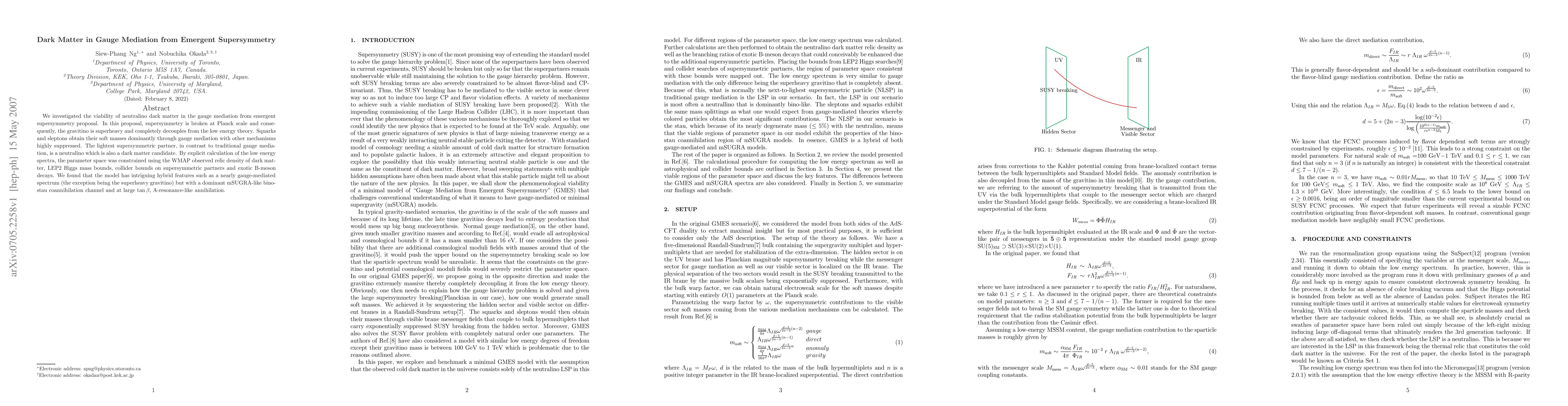 The paper presents a detailed analysis of dark matter in gauge mediation from emergent supersymmetry, identifying a small viable region of parameter space with unique hybrid features.