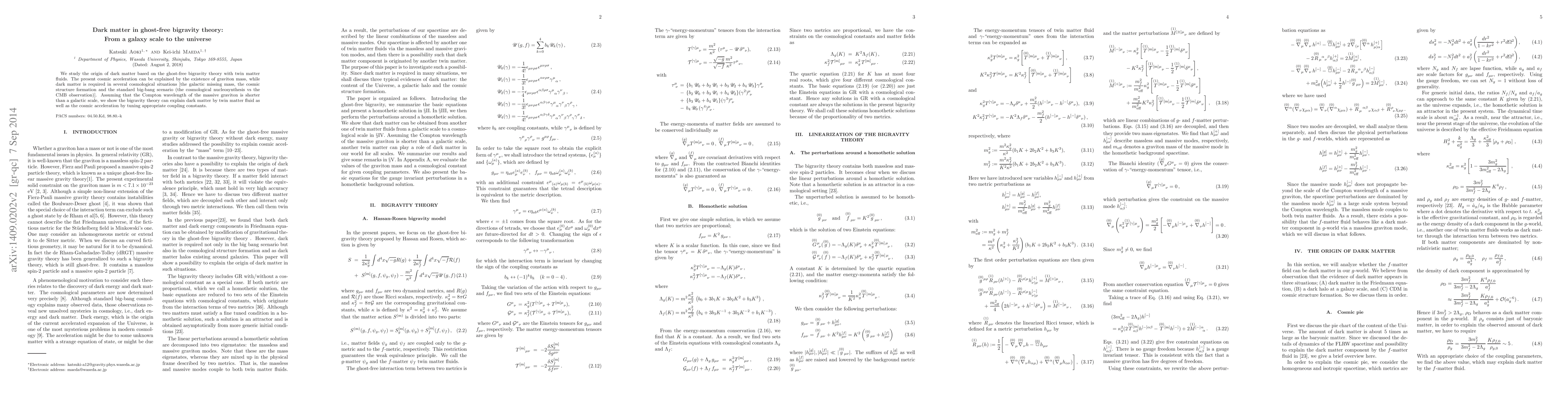 This paper explores dark matter's origin within ghost-free bigravity theory featuring twin matter fluids, showing it can explain galactic missing mass and cosmic structure formation. It also suggests that cosmic acceleration can be attributed to a massive graviton, with coupling constants providing the necessary flexibility.