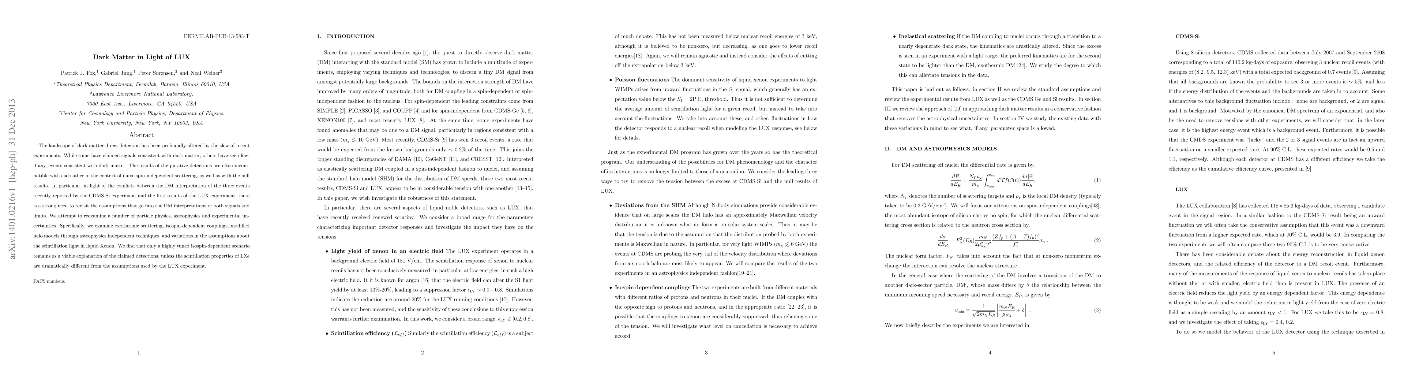 The landscape of dark matter direct detection has been profoundly altered by the slew of recent experiments. While some have claimed signals consistent with dark matter, others have seen few, if any, events consistent with dark matter. The results of the putative detections are often incompatible with each other in the context of naive spin-independent scattering, as well as with the null results. In particular, in light of the conflicts between the DM interpretation of the three events recently reported by the CDMS-Si experiment and the first results of the LUX experiment, there is a strong need to revisit the assumptions that go into the DM interpretations of both signals and limits. We attempt to reexamine a number of particle physics, astrophysics and experimental uncertainties. Specifically, we examine exothermic scattering, isospin-dependent couplings, modified halo models through astrophysics independent techniques, and variations in the assumptions about the scintillation light in liquid Xenon. We find that only a highly tuned isospin-dependent scenario remains as a viable explanation of the claimed detections, unless the scintillation properties of LXe are dramatically different from the assumptions used by the LUX experiment.