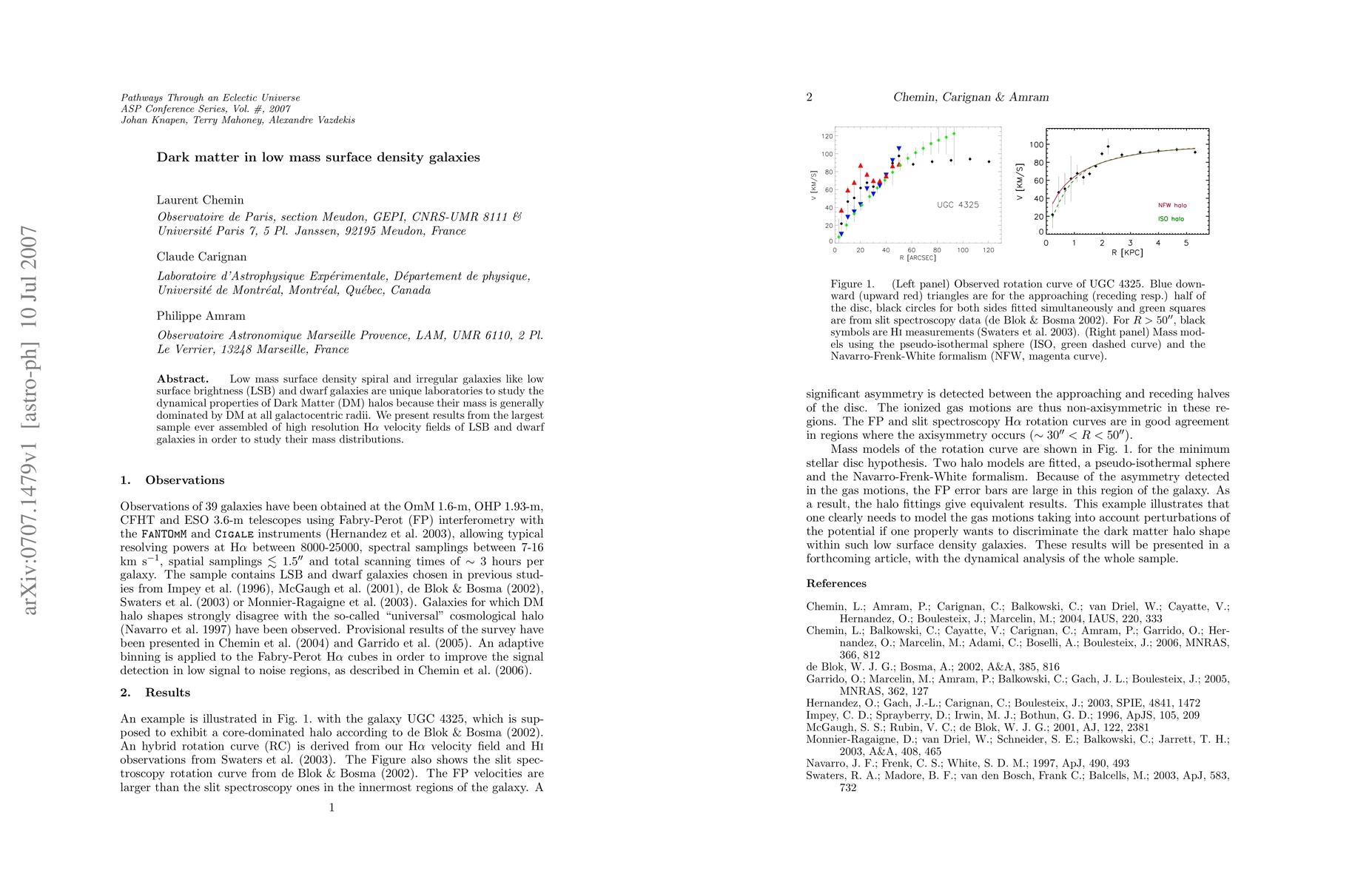 Low mass surface density spiral and irregular galaxies like low surface brightness (LSB) and dwarf galaxies are unique laboratories to study the dynamical properties of Dark Matter halos because their mass is generally dominated by dark matter at all galactocentric radii. We present results from the largest sample ever assembled of high resolution Halpha velocity fields of LSB and dwarf galaxies in order to study their mass distributions.