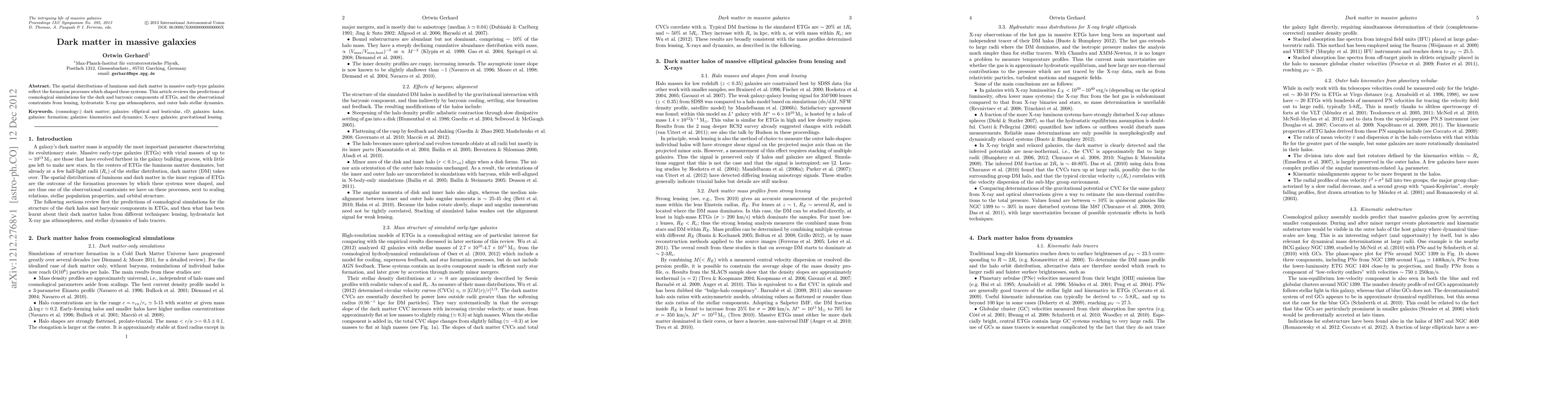 The spatial distributions of luminous and dark matter in massive early-type galaxies reflect the formation processes which shaped these systems. This article reviews the predictions of cosmological simulations for the dark and baryonic components of ETGs, and the observational constraints from lensing, hydrostatic X-ray gas athmospheres, and outer halo stellar dynamics.