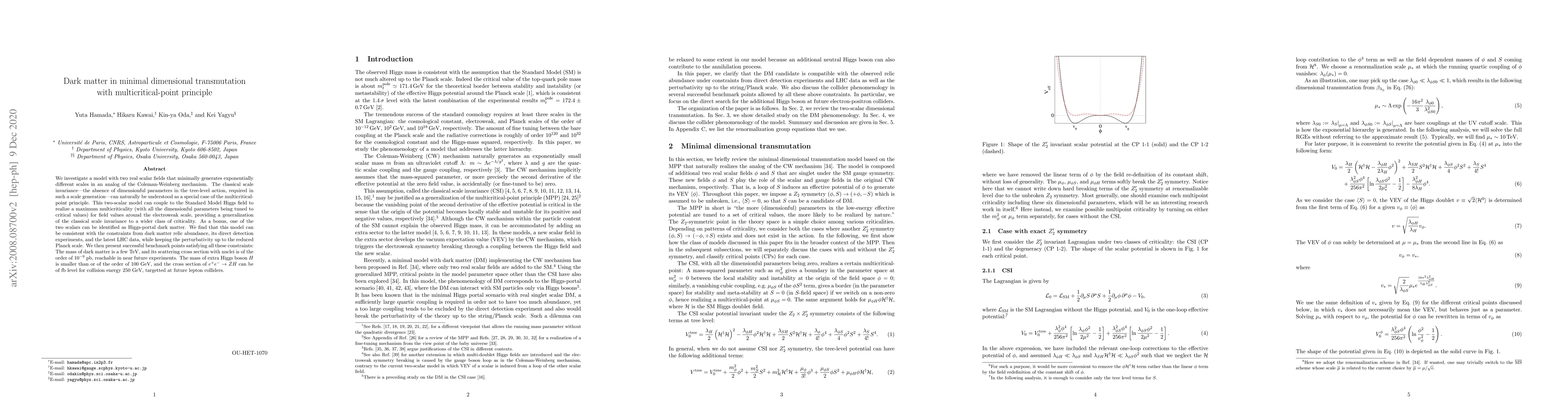 We investigate a model with two real scalar fields that minimally generates exponentially different scales in an analog of the Coleman-Weinberg mechanism. The classical scale invariance -- the absence of dimensionful parameters in the tree-level action, required in such a scale generation -- can naturally be understood as a special case of the multipoint criticality principle. This two-scalar model can couple to the Standard Model Higgs field to realize a maximum multiplicity of criticality for field values around the electroweak scale, providing a generalization of the classical scale invariance to a wider class of criticality. As a bonus, one of the two scalars can be identified as Higgs-portal dark matter. We find that this model can be consistent with the constraints from dark matter relic abundance, its direct detection experiments, and the latest LHC data, while keeping the perturbativity up to the Planck scale. We then present successful benchmark points satisfying all these constraints: The mass of dark matter is a few TeV, and its scattering cross section with nuclei is of the order of $10^{-9}$ pb, reachable in near future experiments. The mass of extra Higgs boson $H$ is smaller than or of the order of 100 GeV, and the cross section of $e^+e^- \to ZH$ can be of fb level for collision energy 250 GeV, targetted at future lepton colliders.