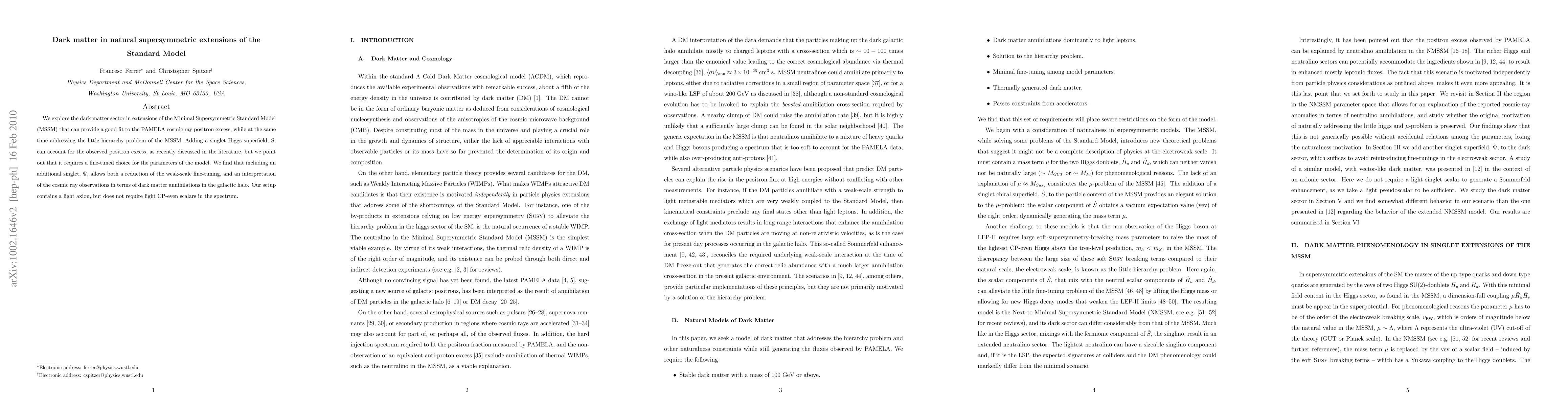 This paper investigates dark matter in extended versions of the Minimal Supersymmetric Standard Model (MSSM) that can explain the PAMELA cosmic ray positron excess and address the little hierarchy problem. It finds that adding a second singlet Higgs superfield can reduce fine-tuning and interpret the positron excess via dark matter annihilations, while also introducing a light axion.