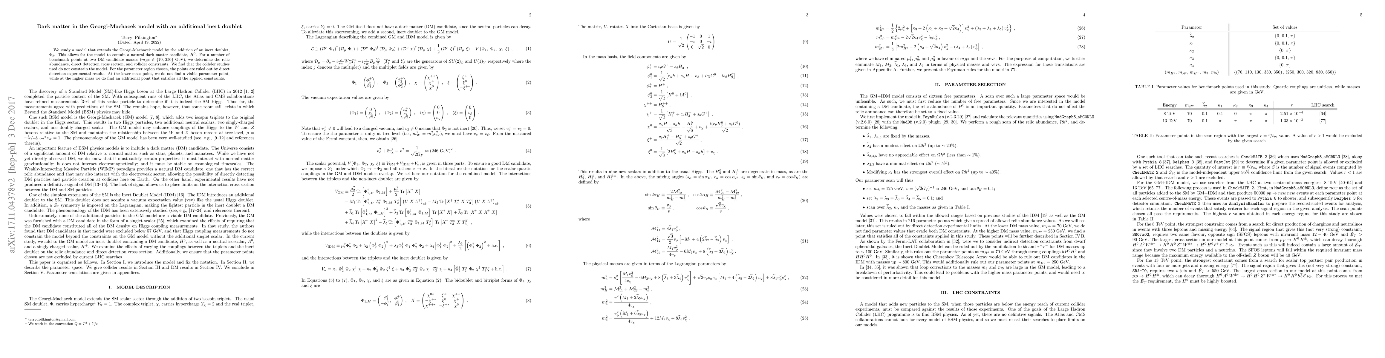 We study a model that extends the Georgi-Machacek model by the addition of an inert doublet, $\Phi_2$. This allows for the model to contain a natural dark matter candidate, $H^0$. For a number of benchmark points at two DM candidate masses ($m_{H^0} \in \{70,\,250\}$ GeV), we determine the relic abundance, direct detection cross section, and collider constraints. We find that the collider studies used do not constrain the model. For the parameter region chosen, the points are ruled out by direct detection experimental results. At the lower mass point, we do not find a viable parameter point, while at the higher mass we do find an additional point that satisfies all the applied constraints.