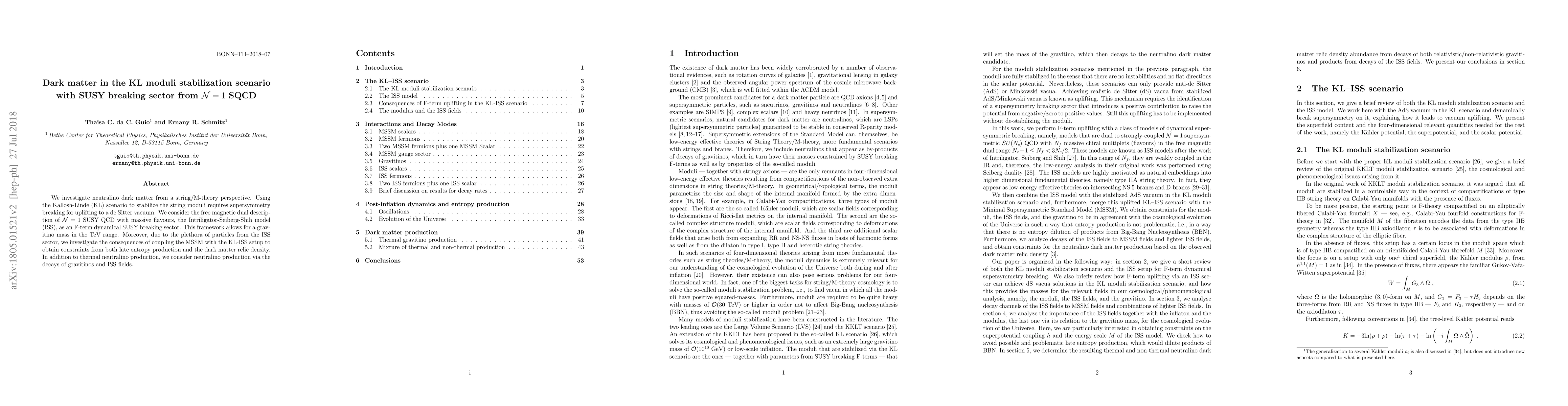 We investigate neutralino dark matter from a string/M-theory perspective. Using the Kallosh-Linde (KL) scenario to stabilize the string moduli requires supersymmetry breaking for uplifting to a de Sitter vacuum. We consider the free magnetic dual description of $\mathcal{N}=1$ SUSY QCD with massive flavours, the Intriligator-Seiberg-Shih model (ISS), as an F-term dynamical SUSY breaking sector. This framework allows for a gravitino mass in the TeV range. Moreover, due to the plethora of particles from the ISS sector, we investigate the consequences of coupling the MSSM with the KL-ISS setup to obtain constraints from both late entropy production and the dark matter relic density. In addition to thermal neutralino production, we consider neutralino production via the decays of gravitinos and ISS fields.