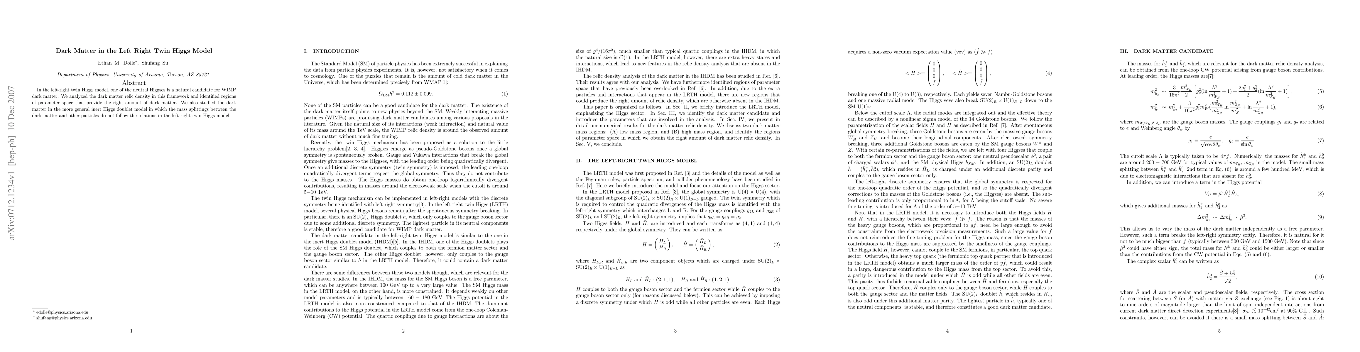 This paper explores the left-right twin Higgs model, identifying a neutral Higgs as a viable WIMP dark matter candidate and analyzing the parameter space for the correct dark matter relic density. It also examines the inert Higgs doublet model, where mass splittings differ from those in the left-right twin Higgs model.