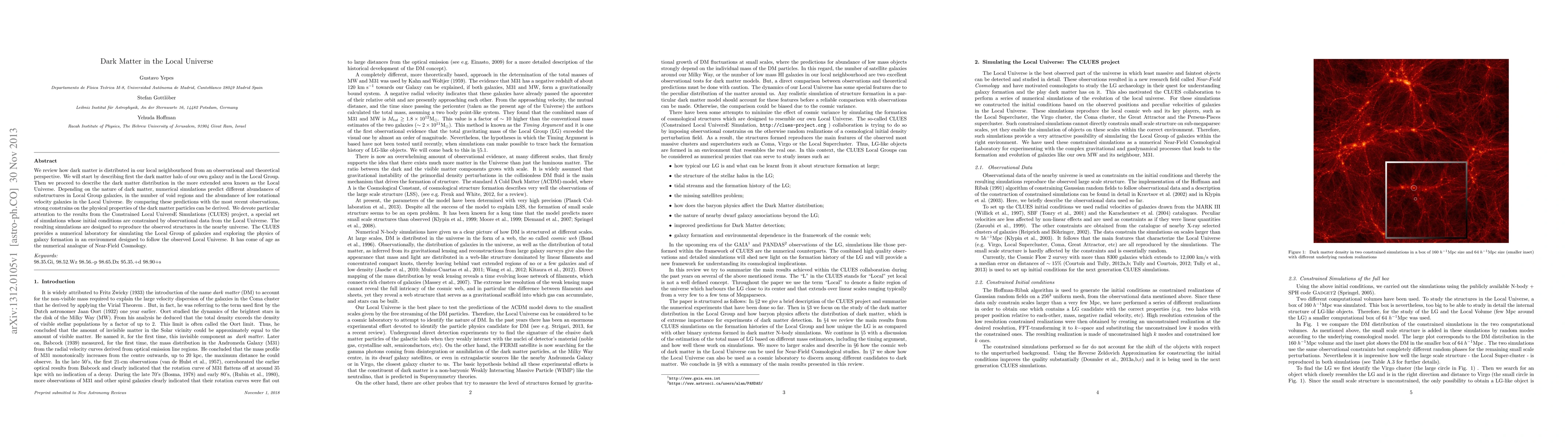 This paper reviews the distribution of dark matter in the Local Group and Local Universe, comparing theoretical predictions from simulations like CLUES with observational data to derive constraints on dark matter properties. The CLUES project, constrained by observational data, aims to reproduce the observed structures in the nearby universe, providing insights into galaxy formation.