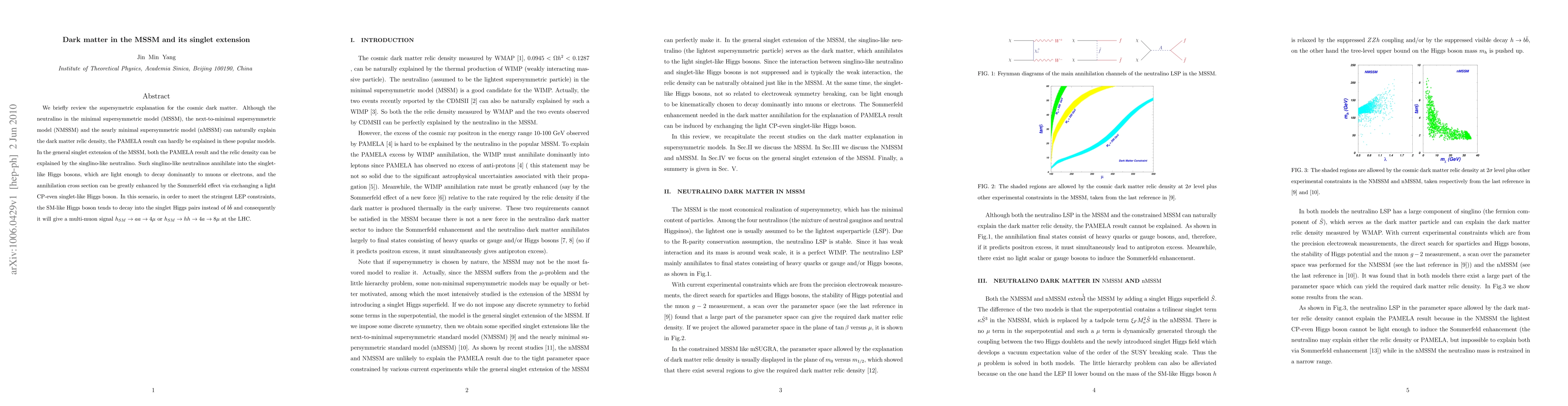 We briefly review the supersymetric explanation for the cosmic dark matter. Although the neutralino in the minimal supersymmetric model (MSSM), the next-to-minimal supersymmetric model (NMSSM) and the nearly minimal supersymmetric model (nMSSM) can naturaly explain the dark matter relic density, the PAMELA result can hardly be explained in these popular models. In the general singlet extension of the MSSM, both the PAMELA result and the relic density can be explained by the singlino-like neutralino. Such singlino-like neutralinos annihilate into the singlet-like Higgs bosons, which are light enough to decay dominantly to muons or electrons, and the annihilation cross section can be greatly enhanced by the Sommerfeld effect via exchanging a light CP-even singlet-like Higgs boson. In this scenario, in order to meet the stringent LEP constraints, the SM-like Higgs boson tends to decay into the singlet Higgs pairs instead of $b\bar b$ and consequently it will give a multi-muon signal $h_SM->aa->\mu$ or $h_{SM}->hh->4 a ->8 \mu$ at the LHC.