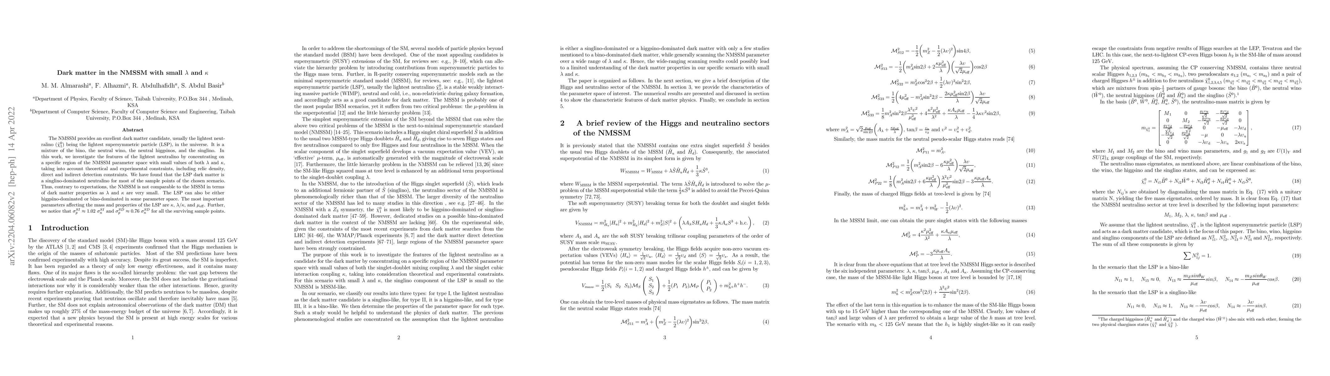 The NMSSM provides an excellent dark matter candidate, usually, the lightest neutralino ($\tilde{\chi}^0_1$) being the lightest supersymmetric particle (LSP), in the universe. It is a mixture of the bino, the neutral wino, the neutral higgsinos, and the singlino. In this work, we investigate the features of the lightest neutralino by concentrating on a specific region of the NMSSM parameter space with small values of both $\lambda$ and $\kappa$, taking into account theoretical and experimental constraints, including relic density, direct and indirect detection constraints. We have found that the LSP dark matter is a singlino-dominated neutralino for most of the sample points of the chosen scenario. Thus, contrary to expectations, the NMSSM is not comparable to the MSSM in terms of dark matter properties as $\lambda$ and $\kappa$ are very small. The LSP can also be either higgsino-dominated or bino-dominated in some parameter space. The most important parameters affecting the mass and properties of the LSP are $\kappa$, $\lambda/\kappa$, and $\mu_{\rm eff}$. Further, we notice that $\sigma^{SI}_p \approx 1.02$ $\sigma^{SI}_n$ and $\sigma^{SD}_p \approx 0.76$ $\sigma^{SD}_n$ for all the surviving sample points.