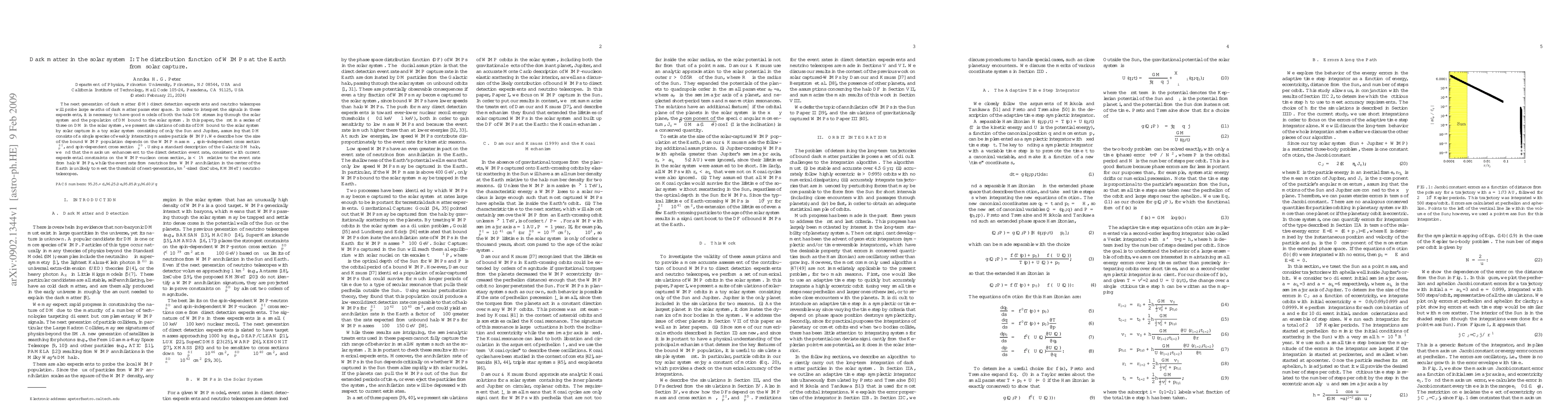 The next generation of dark matter (DM) direct detection experiments and neutrino telescopes will probe large swaths of dark matter parameter space. In order to interpret the signals in these experiments, it is necessary to have good models of both the halo DM streaming through the solar system and the population of DM bound to the solar system. In this paper, the first in a series of three on DM in the solar system, we present simulations of orbits of DM bound to the solar system by solar capture in a toy solar system consisting of only the Sun and Jupiter, assuming that DM consists of a single species of weakly interacting massive particle (WIMP). We describe how the size of the bound WIMP population depends on the WIMP mass, spin-independent cross section, and spin-dependent cross section. Using a standard description of the Galactic DM halo, we find that the maximum enhancement to the direct detection event rate, consistent with current experimental constraints on the WIMP-nucleon cross section, is < 1% relative to the event rate from halo WIMPs, while the event rate from neutrinos from WIMP annihilation in the center of the Earth is unlikely to meet the threshold of next-generation, km^3-sized (IceCube, KM3NeT) neutrino telescopes.