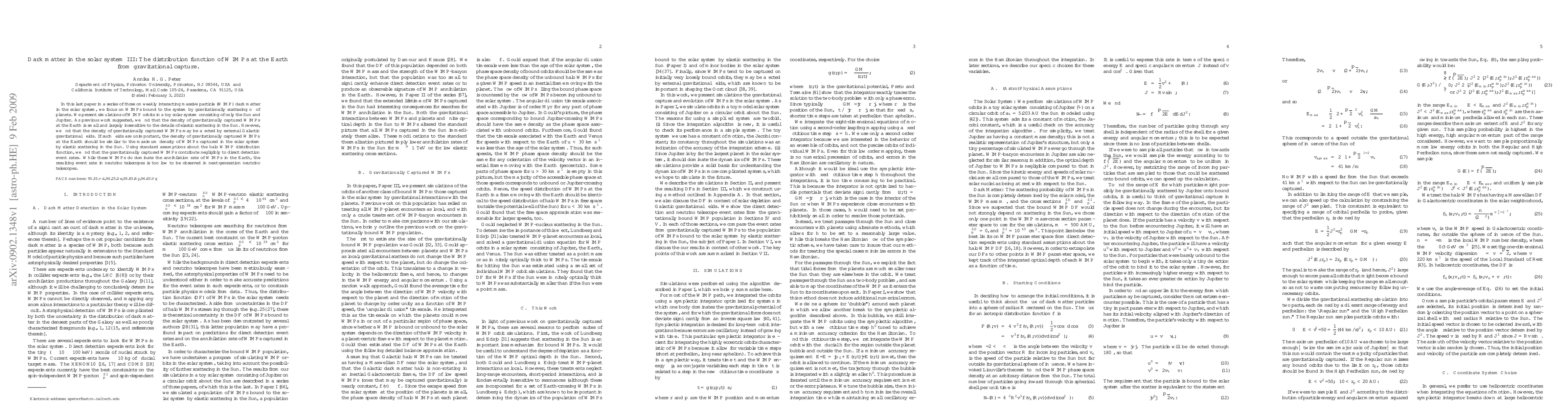 In this last paper in a series of three on weakly interacting massive particle (WIMP) dark matter in the solar system, we focus on WIMPs bound to the system by gravitationally scattering off of planets. We present simulations of WIMP orbits in a toy solar system consisting of only the Sun and Jupiter. As previous work suggested, we find that the density of gravitationally captured WIMPs at the Earth is small and largely insensitive to the details of elastic scattering in the Sun. However, we find that the density of gravitationally captured WIMPs may be affected by external Galactic gravitational fields. If such fields are unimportant, the density of gravitationally captured WIMPs at the Earth should be similar to the maximum density of WIMPs captured in the solar system by elastic scattering in the Sun. Using standard assumptions about the halo WIMP distribution function, we find that the gravitationally captured WIMPs contribute negligibly to direct detection event rates. While these WIMPs do dominate the annihilation rate of WIMPs in the Earth, the resulting event rate in neutrino telescopes is too low to be observed in next-generation neutrino telescopes.