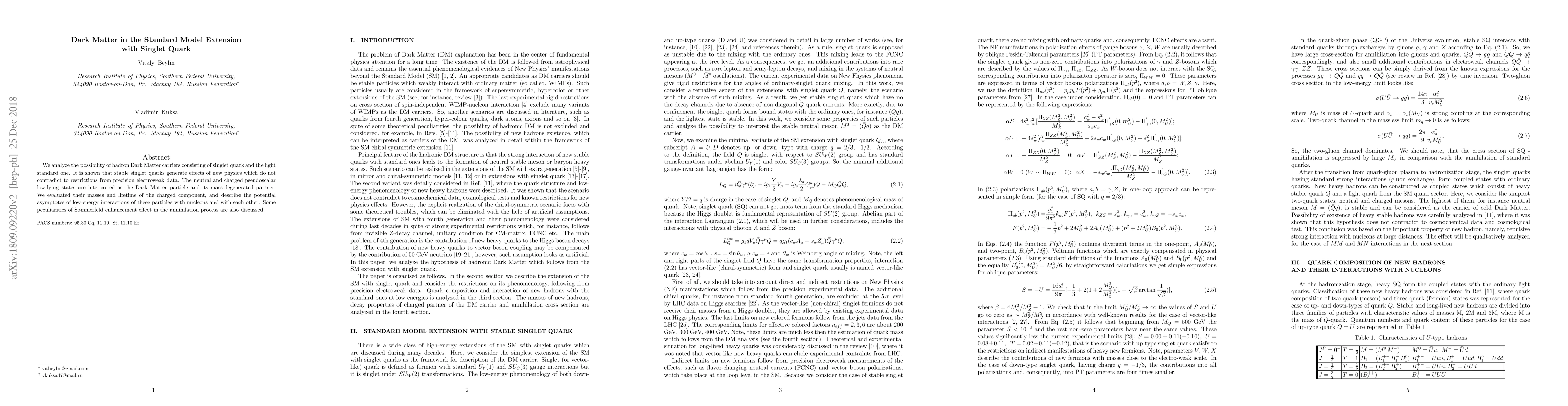 We analyze the possibility of hadron Dark Matter carriers consisting of singlet quark and the light standard one. It is shown that stable singlet quarks generate effects of new physics which do not contradict to restrictions from precision electroweak data. The neutral and charged pseudoscalar low-lying states are interpreted as the Dark Matter particle and its mass-degenerated partner. We evaluated their masses and lifetime of the charged component, and describe asymptotics of the potential of low-energy interactions of these particles with nucleons and with each other. Some peculiarities of Sommerfeld enhancement effect in the annihilation process are also discussed.