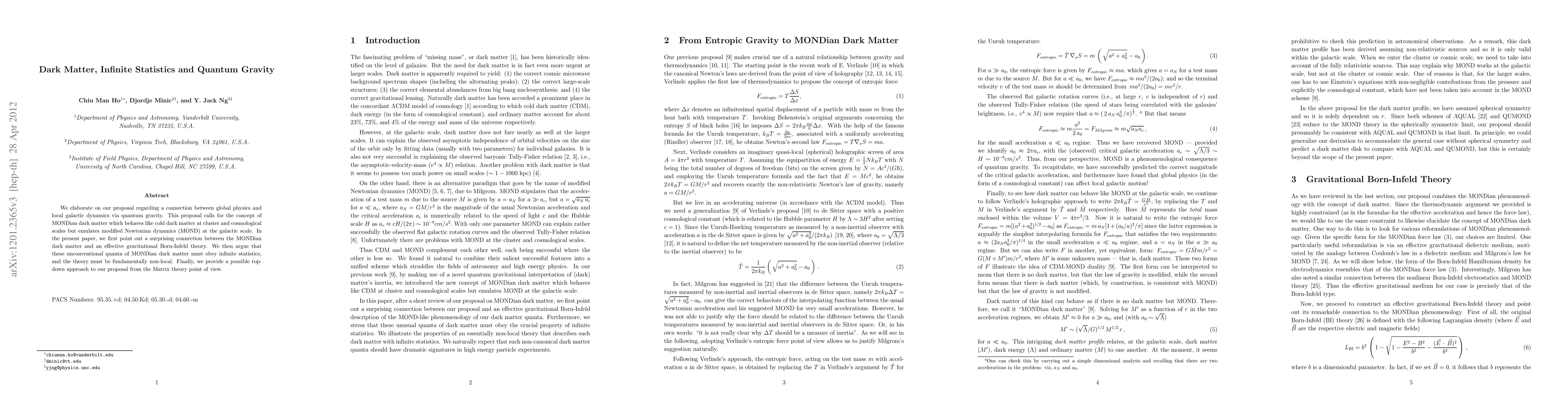 This paper proposes a link between global physics and galactic dynamics through quantum gravity, suggesting MONDian dark matter behaves like cold dark matter on large scales but follows modified Newtonian dynamics at galactic scales. It also reveals a connection between this dark matter and an effective gravitational Born-Infeld theory, positing that these quanta obey infinite statistics and the theory is fundamentally non-local, with a top-down approach from Matrix theory.