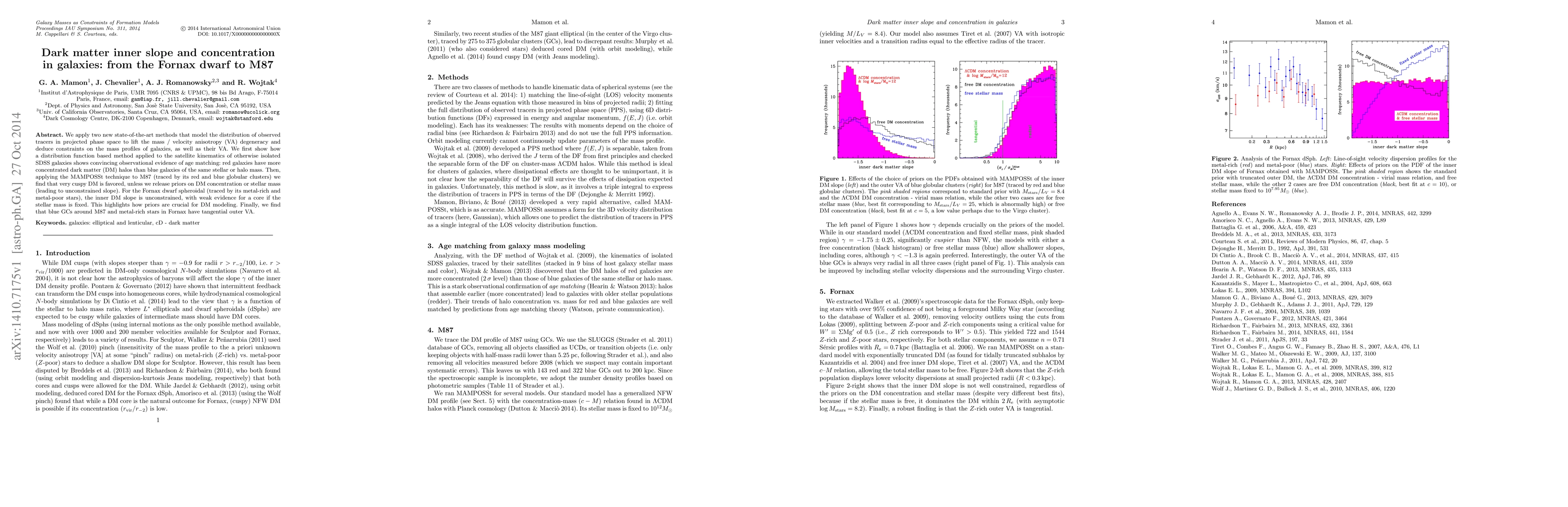We apply two new state-of-the-art methods that model the distribution of observed tracers in projected phase space to lift the mass / velocity anisotropy (VA) degeneracy and deduce constraints on the mass profiles of galaxies, as well as their VA. We first show how a distribution function based method applied to the satellite kinematics of otherwise isolated SDSS galaxies shows convincing observational evidence of age matching: red galaxies have more concentrated dark matter (DM) halos than blue galaxies of the same stellar or halo mass. Then, applying the MAMPOSSt technique to M87 (traced by its red and blue globular clusters) we find that very cuspy DM is favored, unless we release priors on DM concentration or stellar mass (leading to unconstrained slope). For the Fornax dwarf spheroidal (traced by its metal-rich and metal-poor stars), the inner DM slope is unconstrained, with weak evidence for a core if the stellar mass is fixed. This highlights how priors are crucial for DM modeling. Finally, we find that blue GCs around M87 and metal-rich stars in Fornax have tangential outer VA.