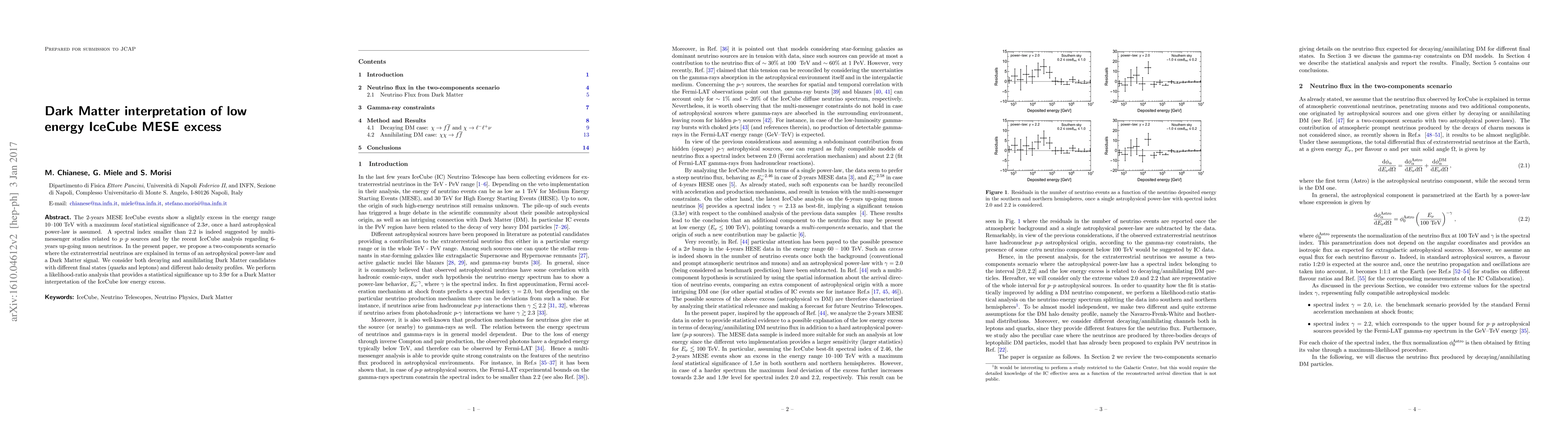 This paper proposes a two-component scenario to explain the low-energy neutrino excess detected by IceCube, attributing part of it to Dark Matter signals alongside an astrophysical power-law. The analysis finds a 3.9$\sigma$ statistical significance supporting a Dark Matter interpretation.