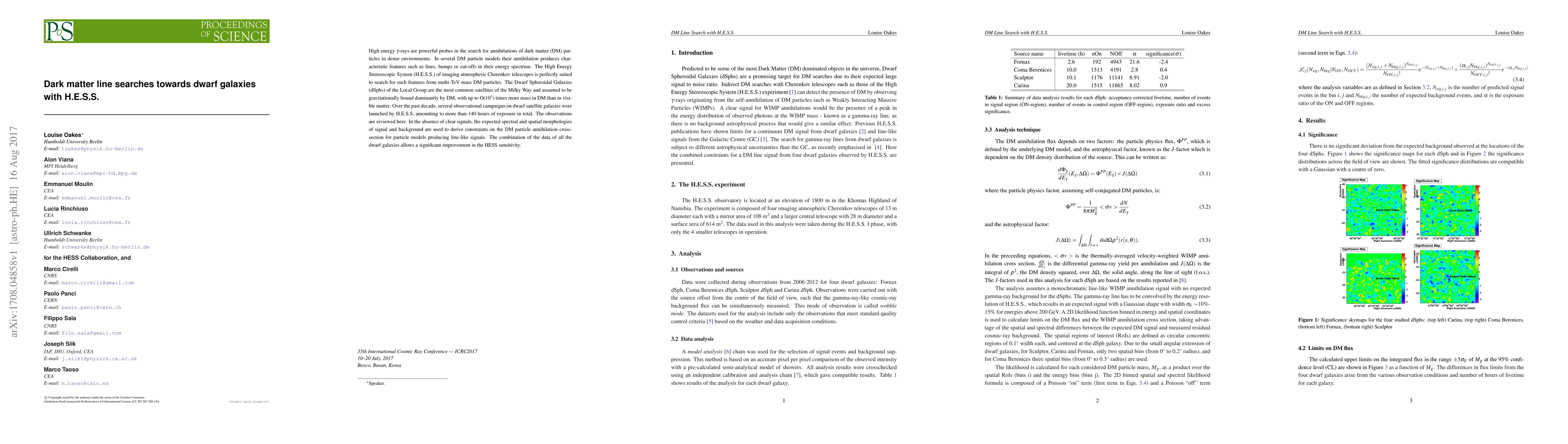 This paper reviews H.E.S.S. observations of Dwarf Spheroidal Galaxies in search of dark matter annihilation signals, particularly line-like features in high-energy gamma-ray spectra. Despite extensive observations, no clear signals are detected, leading to improved constraints on the dark matter particle annihilation cross-section.