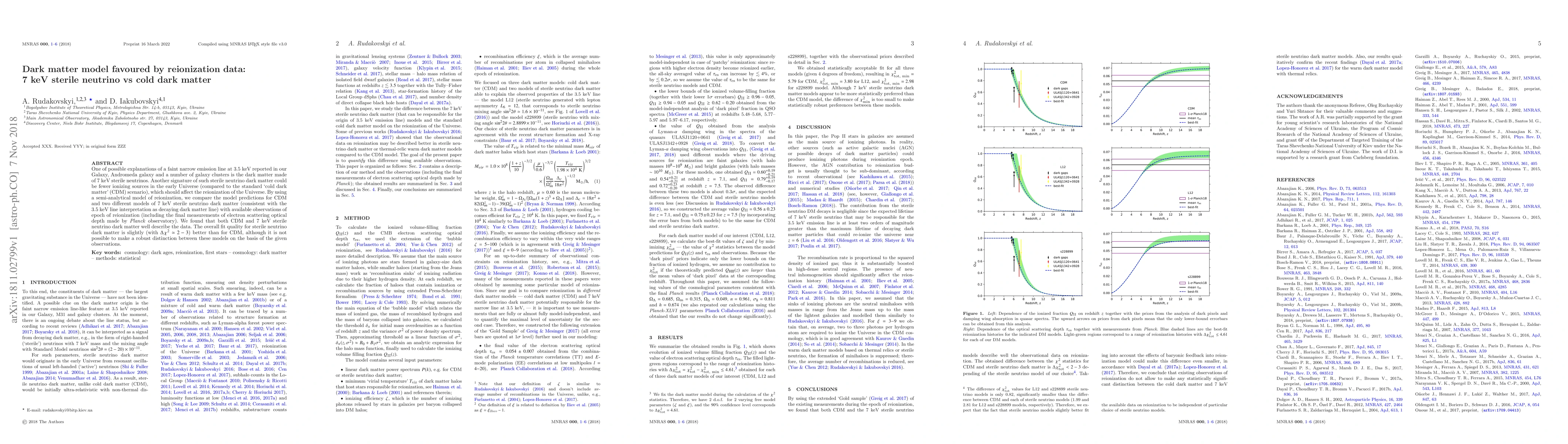 This paper compares the reionization data with predictions from cold dark matter (CDM) and 7 keV sterile neutrino dark matter models, finding that both fit the observations, with the sterile neutrino model providing a slightly better fit. However, the difference is not significant enough to definitively favor one model over the other.