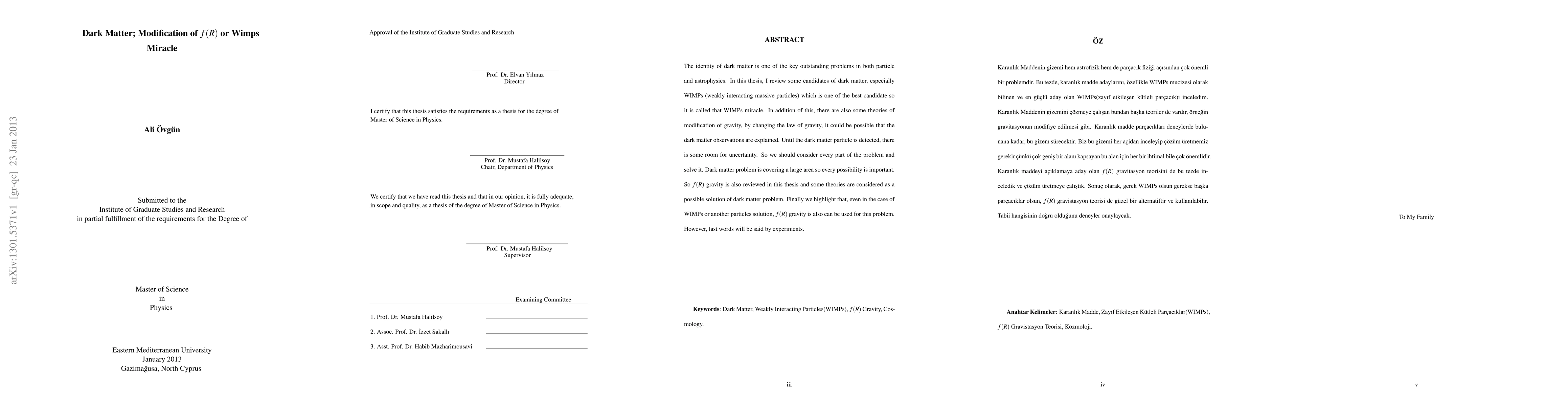 The identity of dark matter is one of the key outstanding problems in both particle and astrophysics. In this thesis, I review some candidates of dark matter, especially WIMPs (weakly interacting massive particles) which is one of the best candidate so it is called that WIMPs miracle. In addition of this, there are also some theories of modification of gravity, by changing the law of gravity, it could be possible that the dark matter observations are explained. Until the dark matter particle is detected, there is some room for uncertainty. So we should consider every part of the problem and solve it. Dark matter problem is covering a large area so every possibility is important. So f(R) gravity is also reviewed in this thesis and some theories are considered as a possible solution of dark matter problem. Finally we highlight that, even in the case of WIMPs or another particles solution, f(R) gravity is also can be used for this problem. However, last words will be said by experiments.